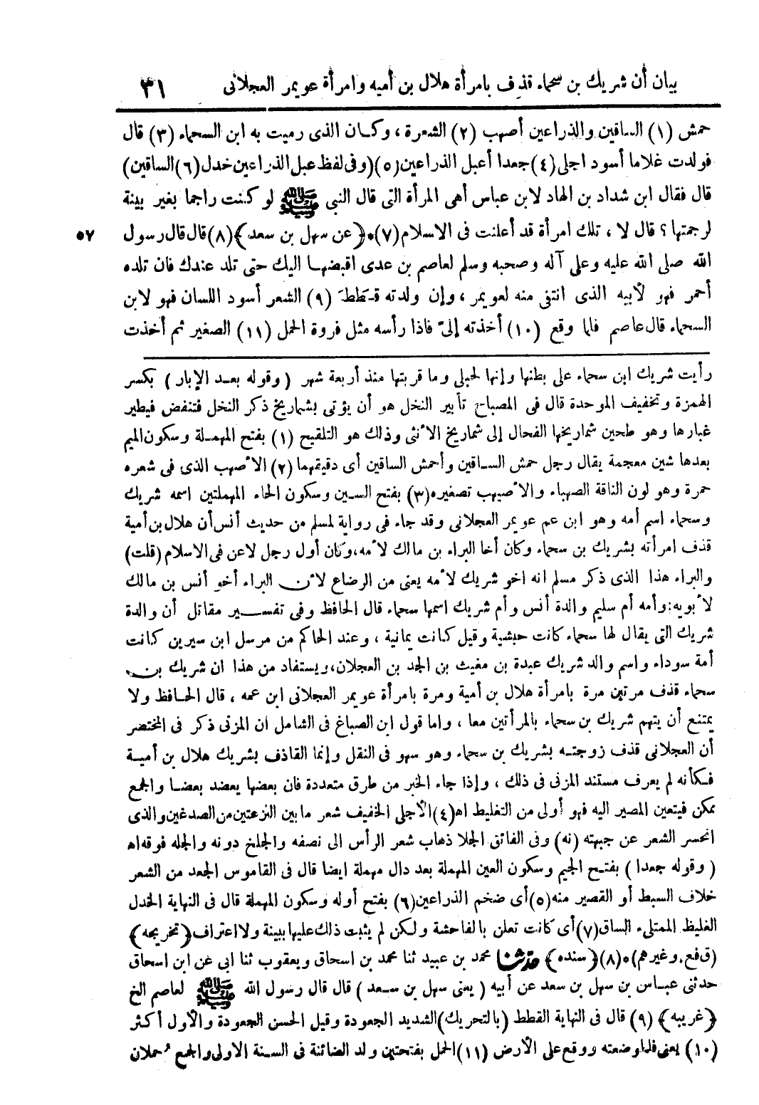 رأيت شريك ابن سحماء على بطنها وانها لحبلى وما قربتها منذ اربعة اشهر (وقولة بعد الابار) بكسر الهمزة وتخفيف الموحدة قال فى المصباح تابير النل هو ان يوتى بشماريخ زكر النخل فتنفض فيطير غبارها وهو طحين شماريخها الفحال الى شماريخ الانثى وذلك هو تلقيح (1) بفتح المهملة وسكون الميم بعدها شين معجمة يقال رجل حمش الساقين اى دقيقها (2) الاصهب الذى فى شعرة حمرة وهو لون الناقة الصهباء والاصيهب تصغيرة (3) بفتح السين وسكون الحاء المهملتين اسمة شريك وسحاء اسم امة وهو ابن عم عويمر العجلانى وقد جاء فى رواية لمسلم من ححديث انس ان هلال بن امية قذف امراتة بشريك بن سحاء وكان اخا البراء بن مالك لامة وكان اول رجل لاعن فى الاسلام (قلت) والبراء هذا الذى ذكر مصسلم انة او شريك لامة يعنى من الرضاع لان البراء اخو انس بن مالك لابوية: وامة ام سليم والدة انس وام شريك اسمها سحاء قال الحافظ وفى تفسيرة مقاتل ان والدة شريك التى يقال لها سحماء كانت حبشية وقيل كانت يمانية وعند الحاكم من مرسل ابن سيرين كانت امة سوداء واسم والد شريك عبدة بن مغيث بن الجد بن عجلان ويستفاد من هذا ان شريك بن سحاء قذف مرتين مرة بامراه هلال بن امية ومرة عويمر العجلانى ابن عمة قال الحافظ ولا يمتنع ان يتهم شريك بن سحماء بالمراتين معا واما قول ابن الصباغ فى الشامل ان المزنى ذكر فى المختصر ان العجلانى قذف زوجتة بشريك بن سحماء وهو سهو فى النقل وانما القاذف بشريك هلال بن امية فكان لم يعرف مستند المزنى فى ذلك واذا جاء الخبر من طرق متعددة فان بعضها يعضد بعضا والجمع ممككن فيتعين المصير الية فهو اولى من التغليط اه (4) الاجلى الخفيف شعر ما بين النزعتين من الصدغين والذى انحسر الشعر عن جبهتة (نة) وفى الفائق الجلا ذهاب شعر الراس الى نصفة والجلغ دونة والجلة فوقة اه (وقولة جعدا) بفتح الجيم وسكون العين المهملة بعد دال مهملة ايضا قال فى القاموس الجعد من الشعر خلاف السبط او القصير منة (5) اى ضم الذراعين (6) بفتح اولة وسكون المهملة قال فى النهاية الدل الغليظ الممتلئ الساق (7) ... اى كانت تعلن بالفاحشة لم يثبت ذلك عليها بينة ولا اعترف (تريجة) (ق فع. وغيرهم) (8) (سندة) ححدثنا محمد بن عبيد ثنا محمد بن اسحاق ويعقوب ثنا ابى عن ابن اسحاق حدثنى عباس بن سهل بن سعد عن ابية (يسنى سهل بن سعد) قال قال رسول اللة صلى اللة علية وسلم لعاصم الخ (غريبة) (9) قال فى النهاية القطط (بالتحريك) الشديد الجعودة وقيل الحسن الجعودة والاول اكثر (10) يعنى فلما وضعتة ووقع على الارض (11) الحمل بفتحتين ولد الضائنة فى السنة الاولى والجمع حملان