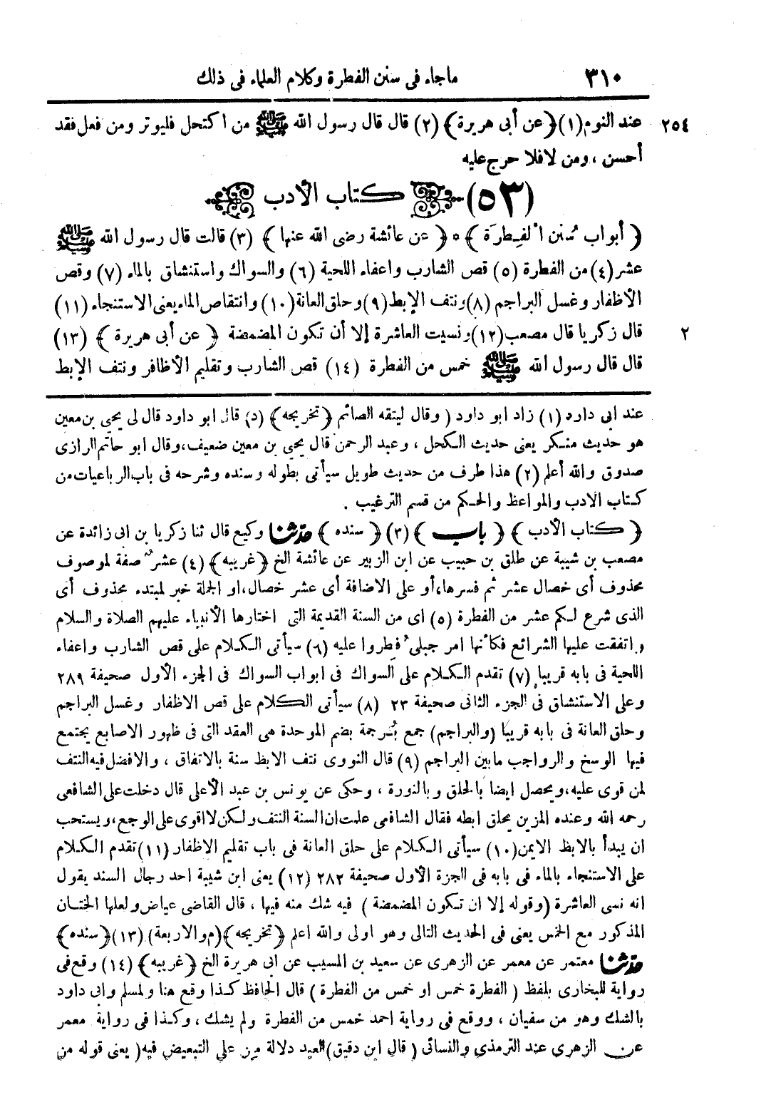 (كتاب الاأدب) (باب) (3) (سنده) حدّثنا وكيع قال ثنا زكريا بن ابى زائدة عن مصعب بن شيبة عن طلق بن حبيب عن ابن الزبير عن عائشة الخ (غريبه) (4) عشرٌ صفة لموصوف محذوف أي خصال عشر ثم فسرها، أو على الاضافة أي عشر خصال، او الجملة خير لمبتدء محذوف أي الذي شرع لكم عشر من الفطرة (5) أي من السنة القديمة التي اختارها الأنبياء عليهم الصلاة والسلام واتفقت عليها الشرائع فكأنها امر جبلى فطروا عليه (6) سيأتى الكلام على قص الشارب واعفاء اللحية في بابه قريبا (7) تقدم الكلام على السواك في ابواب السواك في الجزء الأول صحيفة 289 وعلى الاستنشاق في الجزء الثانى صحيفة 23 (8) سيأتى الكلام على قص الأظفار وغسل البراجم وحلق العانة في بابه قريبا (والبراجم) جمع بُرجمة بضم الموحدة هي العقد التي في ظهور الاصابع يجتمع فيها الوسخ والرواجب ما بين البراجم (9) قال النووى نتف الابط سنة بالاتفاق، والافضل فيه النتف لمن قوى عليه، ويحصل أيضاً بالحلق وبالنورة، وحكى عن يونس بن عبد الأعلى قال دخلت على الشافعى رحمه الله وعنده المزين يحلق ابطه فقال الشافعى علمت أن السنة النتف ولكن لا اقوى على الوجع، ويستحب ان يبدأ بالابط الايمين (10) سيأتى الكلام على حق العانة في باب تقليم الاظفار (11) تقدم الكلام على الاستنجاء بالماء في بابه في الجزة الاول صحيفة 282 (12) يعنى ابن شيبة أحد رجال السند يقول أنه نسى العاشرة (وقوله إلا أن تكون المضمضة) فيه شك منه فيها، قال القاضى عياض ولعلها الختان المذكور مع الخمس يعنى في الحديث التالى وهو أولى والله أعلم (تخريجه) (م والأربعة) (13) (سنده) حدّثنا معتمر عن معمر عن الزهرى عن سعيد بن المسيب عن أبى هريرة الخ (غريبه) (14) وقع في رواية للبخارى بلفظ (الفطرة خمس أو خمس من الفطرة) قال الحافظ كذا وقع هنا ولمسلم وأبى داود بالشك وهو من سفيان، ووقع في رواية أحمد خمس من الفطرة ولم يشك، وكذا في رواية معمر عن الزهرى عند الترمذى والنسائى (قال ابن دقيق) العبد دلالة من على التبعيض فيه (يعنى قوله من