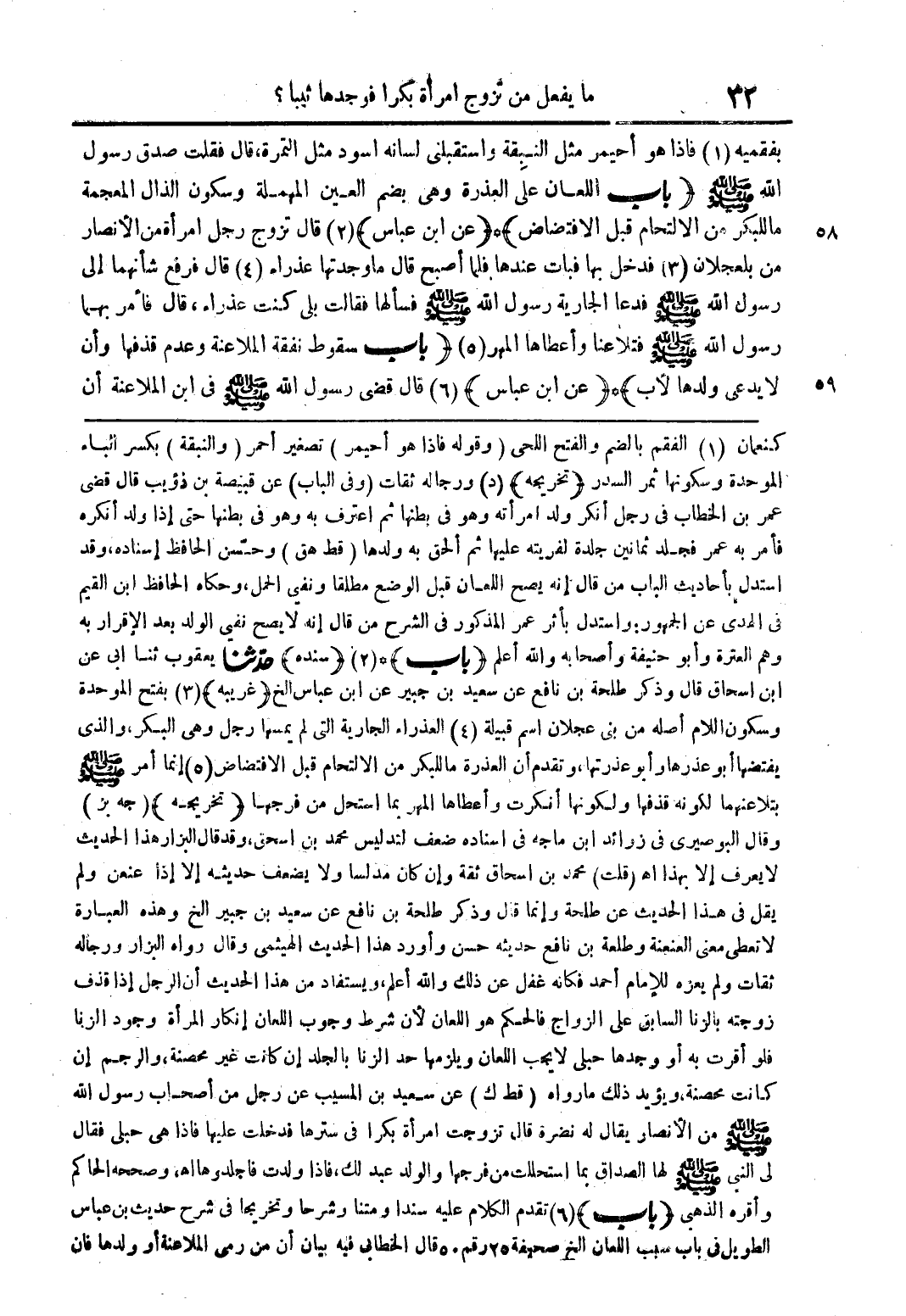 كنعمان (1) الفقم بالضم والفتح الحى (وقولة فاذا هو احيمر) تصغير احمر (والنبقة) بكسر الباء الموحدة وسكونها ثمر السدر (تريجة) (د) ورجالة ثقات (وفى الباب) عن قبيضة بن ذؤيب قال قضى عمر بن الطاب فى رجل انكر ولد امراتة وهو فى بطنها ثم اعترف بة وهو فى بطنها حتى اذا ولد انكرة فامر بة عمر فجلد ثمانين جلدة لفريتة عليها ثم الحق بة ولدها (قط هق) وحسن الحافظ اسنادة وقد استدل بالاحاديث الباب من قال انة يصح اللعان قبل الوضع مطلقا ونفى الحمل وحكاه الحافظ ابن القيم فى الهدى عن الجمهور واستدل باثر عمر المذكور فى الشرح من قال انة لا يصح نفى الولد بعد الاقرار بة وهم العترة وابو حنيفة واصحابة واللة اعلم (باب) (2) (سندة) حدثنا يعقوب ثنا ابى عن ابن اسحاق قال وذكر طلحة بن نافع عن سعيد بن جبير عن ابن عباس الخ (غريبة) (3) بفتح الموحدة وسكون اللام اصلة من بنى عجلان اسم قبيلة (4) العذراء الجارية التى لم يمسها رجل وهى البكر والذى يفتضها ابو عذرها وابو عذرتها وتقدم ان العذرة ما للبكر من الالتحام قبل الافتضاض (5) انما امر صلى اللة علية وسلم بتلاعنهما لكونة قذفها ولكونها انكرت واعطاها المهر بما استحل من فرجها (تخريجة) (جة بز) وقال البوصيرى فى زوائد ابن ماجة فى اسنادة ضعف لتدليس محمد بن اسحاق وقد قال البزار هذا الحديث لا يعرف الا بهذا اه (قلت) محمد بن اسحاق ثقة وان كان مدلسا ولا يضعف حديثة الا اذا عنمن ولم يقل فى هذا الحديث عن طلحة وانما قال وذكر طلحة بن نافع عن سعيد بن جبير الخ وهذة العبارة لا تعطى معنى العنعنة وطلعة بن نافع حديثة حسن واورد هذا الهيثمى وقال رواء البزار ورجالة ثقات ولم يعزة للامام احمد فكانة غفل عن ذلك واللة اعلم ويستفاد من هذا الحديث ان الرجل اذا قذف زوجتة بالزنا السابق على الزواج فالحكم هو اللعان لان شرط وجوب اللعان انكار المأة وجود الزنا فلو اقرت بة او وجدها حبلى لا يجب اللعان ويلزمها حد الزنا بالجلد ان كانت غير محصنة والرجم ان كانت محصنة ويؤيد ذلك ما رواه (قط ك) عن سعيد بن المسيب عن رجل من اصحاب رسول اللة صلى اللة علية وسلم من الانصار يقال لة نضرة قال تزوجت امراه بكرا فى سترها فدخلت عليها فاذا هى حبلى فقال لى النبى صلى اللة علية وسلم لها الصداق بما استحللت من فرجها والولد عبد لك ولدت فاجلدوهااه وصححة الحاكم واقرا الذهبى (باب) (6) تقدم الكلام علية سندا ومتنا وشرحا وتريجا فى شرح حديث بن عباس الطويل فى باب سبب اللعان صحيفة 25 رقم 50 قال الخطابى فية بيان ان من رمى الملاعنة أو ولدها فإن