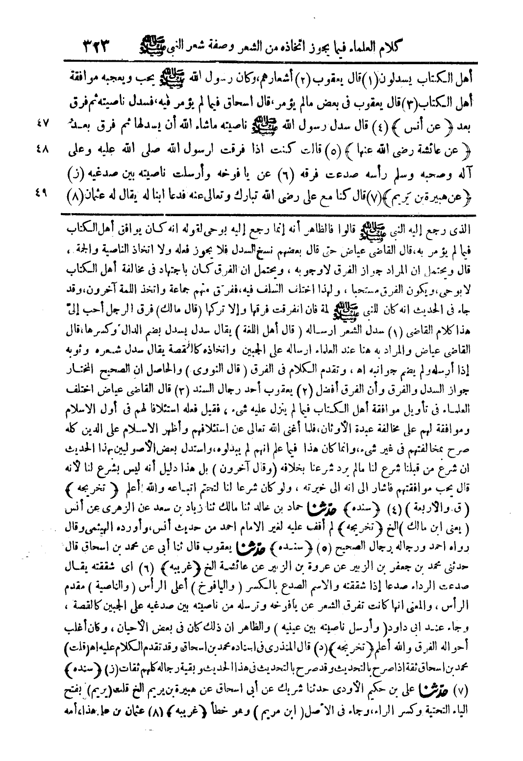 أهل الكتاب يسدلون (1) قال يعقوب (2) أشعارهم، وكان رسول الله صلى الله عليه وسلم يحب ويعجبه موافقة أهل الكتاب (3) قال يعقوب في بعض ما لم يؤمر، قال اسحاق فيما لم يؤمر فيه، فسدل ناصيته ثم فرق بعد (عن أنس) (4) قال سدل رسول الله صلى الله عليه وسلم ناصيته ما شاء الله أن يسدلها ثم فرق بعدٌ (عن عائشة رضي الله عنها) (5) قالت كنت اذا فرقت لرسول الله صلى الله عليه وعلى آله وصحبه وسلم رأسه صدعت فرقة (6) عن يافوخه وأرسلت ناصيته بين صدغيه (ز) (عن هبيرة بن يريم) (7) قال كنا مع على رضي الله تبارك وتعالى عنه فدعا ابنا له يقال له عثمان (8)