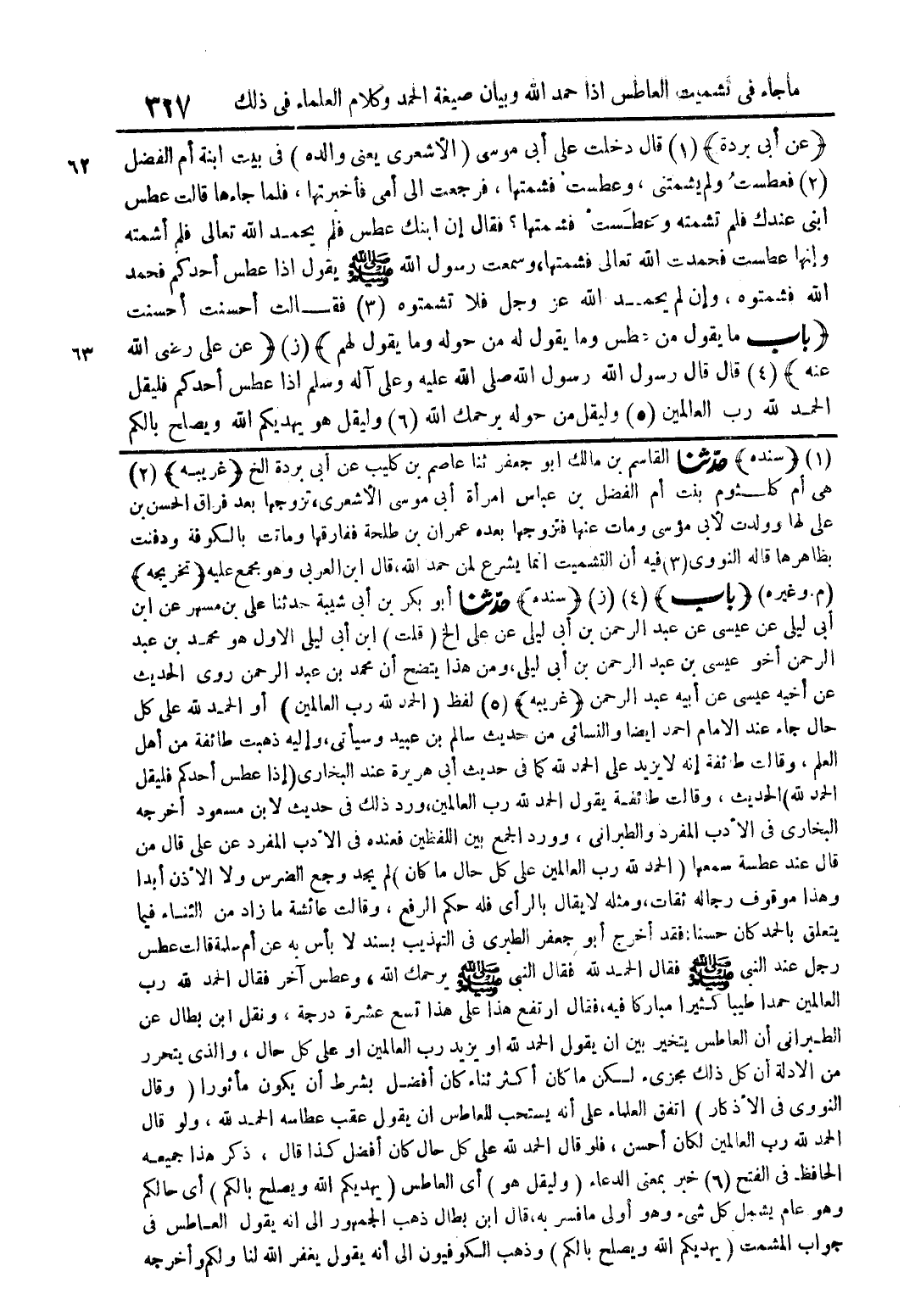(عن أبي بردة) (1) قال دخلت على أبى موسى (الأشعرى يعنى والده) في بيت ابنة أم الفضل (2) فعطست ولم يشمتنى، وعطست فشمتها، فرجعت إلى أمى فأخبرتها، فلما جاءها قالت عطس ابنى عندك فلم تشمته وعطست فشمتها؟ فقال إن ابنك عطس فلم يحمد الله تعالى فلم أشمته وإنها عطست فحمدت الله تعالى فشمتها، وسمعت رسول الله صلى الله عليه وسلم يقول إذا عطس أحدكم فحمد الله فشمتوهن وإن لم يحمد الله عز وجل فلا تشمتوه (3) فقالت أحسنت أحسنت (باب ما يقول من عطس وما يقول له من حوله وما يقول لهم) (ز) (عن على رضي الله عنه) (4) قال قال رسول الله رسول الله صلى الله عليه وعلى آله وسلم إذا عطس أحدكم فليقل الحمد لله رب العالمين (5) وليقل من حوله يرحمك الله (6) وليقل هو يهديكم الله ويصلح بالكم