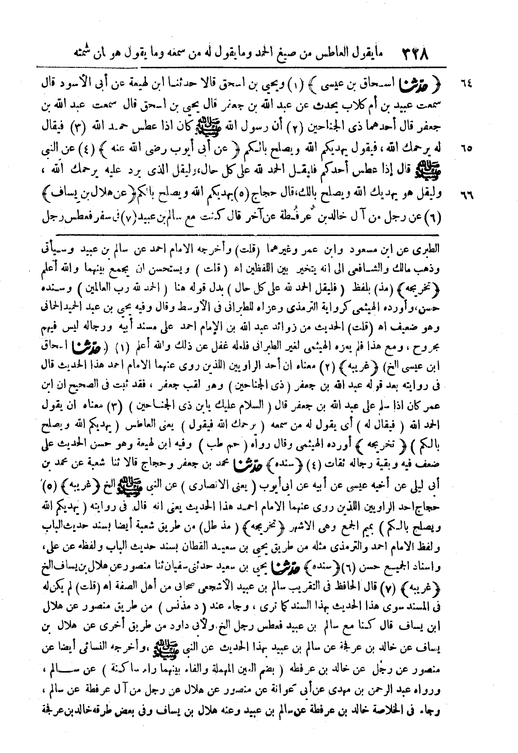 (حدّثنا إسحاق بن عيسى) 01) ويحيى بن اسحق قالا حدثنا ابن لهيعة عن أبى الأسود قال سمعت عبيد بن أم كلاب يحدث عن عبد الله بن جعفر قال يحيى بن اسحق قال سمعت عبد الله بن جعفر قال أحدهما ذي الجناحين (2) أن رسول الله صلى الله عليه وسلم كان اذا عطس حمد الله (3) فيقال له يرحمك الله، فيقول يهديكم الله ويصلح بالكم (عن أبى أيوب رضي الله عنه) (4) عن النبي صلى الله عليه وسلم قال إذا عطس أحدكم فليقل الحمد لله على كل حال، وليقل الذي يرد عليه يرحمك الله، وليقل هو يهديك الله ويصلح بالك، قال حجاج (5) يهديكم الله ويصلح بالكم (عن هلال بن يساف) (6) عن رجل من آل خالدين عرفطة عن آخر قال كنت مع سالم بن عبيد (7) في سفر فعطس رجل