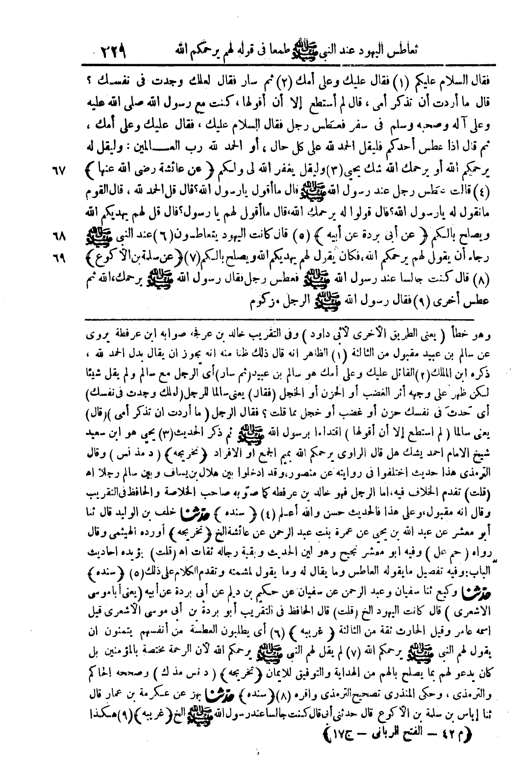 وهو خطأ (يعنى الطريق الأخرى لأبى داود) وفي التقريب خالد بن عرفجه صوابه ابن عرفطه يروى عن سالم بن عبيد مقبول من الثالثة (1) الظاهر أنه قال ذلك ظناً منه أنه يجوز أن يقال بدل الحمد لله، ذكره ابن الملك (2) القائل عليك وعلى أمك هو سالم بن عبيد (ثم سار) أي الرجل مع سالم ولم يقل شيئاً لكن ظهر على وجهه أثر الغضب أو الحزن أو الخجل (فقال) يعنى سالماً للرجل (لملك وجدت في نفسك أي حدث في نفسك حزن أو غضب أو خجل مما قلت؟ فقال الرجل (ما أردت أن تذكر أمى) (قال) يعنى سالما (لم استطع إلا أن أقولها) اقتداءا برسول الله صلى الله عليه وسلم ثم ذكر الحديث (3) يحيى هو ابن سعيد شيخ الإمام أحمد يشك هل قال الراوى يرحمكم الله بميم الجمع أو الافراد (تخريجه) (د مذ نس) وقال الترمذى هذا حديث اختلفوا في روايته عن منصور، وقد ادخلوا بين هلال بن يساف وبين سالم رجلا اهـ (قلت) تقدم الخلاف فيه، اما الرجل فهو خالد بن عرفطة كما صوّبه صاحب الخلاصة والحافظ في التقريب وقال انه مقبول، وعلى هذا فالحديث حسن والله أعلم (4) (سنده) حدّثنا خلف بن الوليد قال ثنا أبو معشر عن عبد الله بن يحيى عن عمرة بنت عبد الرحمن عن عائشة الخ (تخريجه) أورده الهيثمى وقال رواه (حم عل) وفيه أبو معشر نجيح وهو لين الحديث وبقية رجاله ثقات اهـ (قلت) يؤيده احاديث الباب: وفيه تفصيل ما يقوله العاطس وما يقال له وما يقول لمشمته وتقدم الكلام على ذلك (5) (سنده) حدّثنا وكيع ثنا سفيان وعبد الرحمن عن سفيان عن حكيم بن ديلم عن أبى بردة عن أبيه (يعنى أبا موسى الاشعرى) قال كانت اليهود الخ (قلت) قال الحافظ في التقريب أبو بردة بن أبى موسى الأشعرى قيل اسمه عامر وقيل الحارث ثقة من الثالثة (غريبه) (6) أي يطلبون العطسة من أنفسهم يتمنون أن يقول لهم النبي صلى الله عليه وسلم يرحمكم (7) لم يقل لهم صلى الله عليه وسلم يرحمكم الله لأن الرحمة مختصة بالمؤمنين بل كان يدعو لهم بما يصلح بالهم من الهداية والتوفيق للايمان (تخريجه) (د نس مذ ك) وصححه الحاكم والترمذى، وحكى المنذرى تصحيح الترمذى واقره (8) (سنده) حدّثنا بهز عن عكرمة بن عمار قال ثنا إياس بن سلمة بن الأكوع قال حدثنى أبى قال كنت جالساً عند رسول الله صلى الله عليه وسلم الخ (غريبه) (9) هكذا