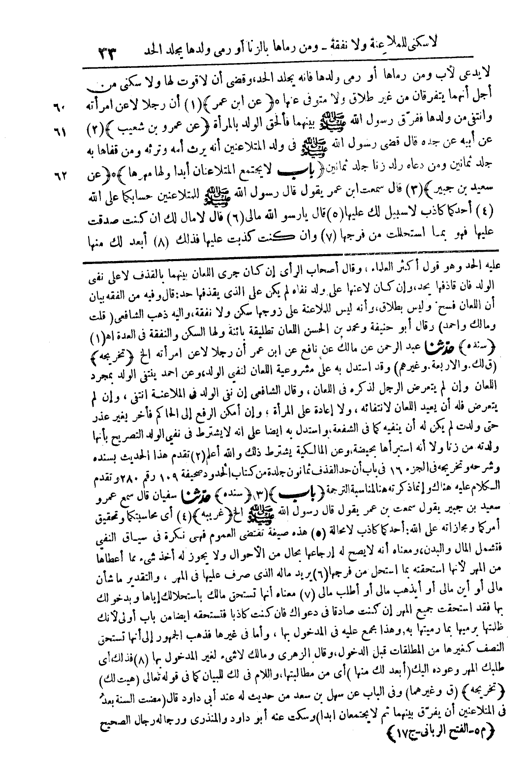 عليه الحد وهو قول اكثر العلماء وقال احاب الراى ان كان جرى اللعان بينهما بالقذف لاعلى نفى الولد فان قاذفها يحد وان كان لاعنها على ولد نفاه لم يكن على الذى يقذفها حد: قال وفية من الفقة بيان ان اللعان فس وليس بطلاق وانة ليس لللاعنة على زوجها سكن ولا نفقة والية ذهب الشافعى (قلت) ومالك واحمد وقال ابو حنيفة ومحمد بن الحسن اللعان تطليقة بائنة ولها السكن والنفقة فى العدة اه (1) (سندة) حدثنا عبد الرحمن عن مالك عن نافع عن ابن عمر ان رجلا لاعن امراتة ال (تريجة) (ق لك. والاربعة. وغيرهم) وقد استدل بة على مشروعية اللعان لنفى الولد وعن احمد ينتفى الولد بمجرد اللعان وان لم يتعرض فلة ان يعيد اللعان لا نتفائة ولا اعادة على االمراة وان امكن الرفع الى الحاكم فاخر بغير عذر حتى ولدت لم يكن لة ان ينفية كما فى الشفعة واستدل بة ايضا على انة لا يشترط فى نفى الولد التصريح بانها ولدتة من زنا ولا انة استبرأها بحيضة وعن المالكية يشترط ذلك واللة اعلم (2) تقدم هذا الحديث بسندة وشرحة وتخريجة فى الجزء 16 فى باب ان حد القذف ثمانون جلدة من كتاب الحدود صحيفة 109 رقم 280 وتقدم الكلام علية هناك وانما ذكرتة هنا لمناسبة الترجمة (3) (سندة) حدثنا سفيان قال سمع عمرو سعيد بن جبير يقول سمعت بن عمر يقول قال رسول اللة صلى اللة علية وسلم الخ (غريبة) (4) اى محاسبتكما وتحقيق امركما ومجازاتة على اللة: احد كما كاذب لا محالة (5) هذه صيغة تقتضى العموم فهى نكرة فى سياق النفى فتشمل المال والبدن ومعناه انة لا يصح لة ارجاعها بحال من الاحوال ولا يجوز لة اخذ اخذ شئ مما اعطاها من المهر لانها استحقتة بما استحل من فرجها (6) يريد مالة الذى صرف عليها فى المهر والتقدير ما شان مالى او اين مالى او يذهب مالى او اطلب مالى (7) معناه انها تستحق مالك باستحلالك اياها وبدولك بها فقد استحقت جميع المهر ان كنت صادقا فى عواك فان كنت كاذبا فتستحقة ايضا من باب اولى لانك ظلتها برميها بما رميتها بة وهذا مجمع علية فى المدخول بها واما فى غيرها فذهب الجمهور الى انها تستحق النصف كغيرها من المطلقات قبل الدخول وقال الزهرى ومالك لا شئ لغير المدخول بها (8) فذلك اى طلبك المهر وعودة اليك (ابعد لك منها) اى من مطالبتها واللام فى لك للبيان كما فى قولة تعالى (هيت لك) (تريجة) (ق وغيرهما) وفى الباب عن سهل بن سعد من حديث لة عند ابى داود قال (مضت السنة بعد فى المتلاعنين ان يفرق بينهما ثم لا يجتمعان ابدا) وسكت عنة ابو داود والمنذرى ورجالة رجال الصحيح