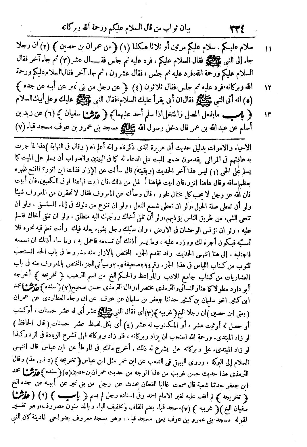 سلام عليكم. سلام عليكم مرتين أو ثلاثا هكذا (1) (عن عمران ابن حصين) (2) أن رجلا جاء إلى النبي صلى الله عليه وسلم فقال السلام عليكم، فرد عليه ثم جلس فقال عشر (3) ثم جاء آخر فقال السلام عليكم ورحمة الله، فرد عليه ثم جلس، فقال عشرون، ثم جاء آخر فقال السلام عليكم ورحمة الله وبركاته، فرد عليه ثم جلس، فقال ثلاثون (4) (عن رجل من بني نمير عن أبيه عن جده) (5) أنه أتى النبي صلى الله عليه وسلم فقال أن أبي يقرأ عليك السلام، فقال النبي صلى الله عليه وسلم عليك وعلى أبيك السلام (باب ما يفعل المصلي والمتخلي إذا سلم أحد عليهما) (حدثنا سفيان) (6) عن زيد بن أسلم عن عبد الله بن عمر قال دخل رسول الله صلى الله عليه وسلم مسجد بني عمرو بن عوف مسجد قباء (7)