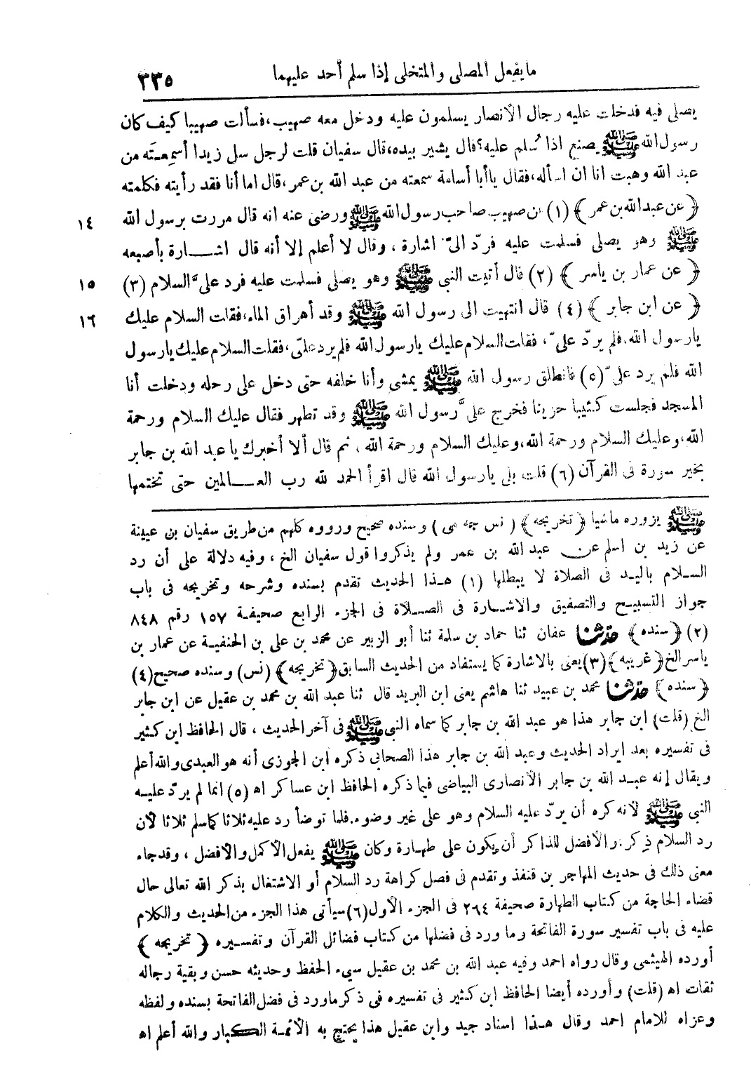 يصلي فيه فدخلت عليه رجال الأنصار يسلمون عليه ودخل معه صهيب، فسألت صهيبًا كيف كان رسول الله صلى الله عليه وسلم يصنع إذا سلم عليه؟ قال يشير بيده، قال سفيان قلت لرجل سل زيدًا أسمعته من عبد الله وبت أنا أن أسأله، فقال يا أبا أسامة سمعته من عبد الله بن عمر، قال أما أنا فقد رأيته فكلمته (عن عبد الله بن عمر) (1) أن صهيب صاحب رسول الله صلى الله عليه وسلم ورضي عنه أنه قال مررت برسول الله صلى الله عليه وسلم وهو يصلي فسلمت عليه فرّد إليّ أشارة، وقال لا أعلم إلا أنه قال أشارة بأصبعه (عن عمار بن ياسر) (2) قال أتيت النبي صلى الله عليه وسلم وهو يصلي فسلمت عليه فرد عليَّ السلام (3) (عن ابن جابر) (4) قال انتهيت إلى رسول الله صلى الله عليه وسلم وقد أهراق الماء، فقلت السلام عليك يا رسول الله، فبم يرّد عليّ، فقلت السلام عليك يا رسول الله فلم يرد عليّ، فقلت السلام عليك يا رسول الله فلم يرد عليّ (5) فانطلق رسول الله صلى الله عليه وسلم يمشي وأنا خلفه حتى دخل على رحله ودخلت أنا المسجد فجلست كئيبًا حزينًا فخرج عليَّ سول الله صلى الله عليه وسلم وقد تظهر فقال عليك السلام ورحمة الله، وعليك السلام ورحمة الله، وعليك السلام ورحمة الله، ثم قال ألا أخبرك يا عبد الله بن جابر يخير سورة في القرآن (6) قلت بلى يا رسول الله قال اقرأ الحمد لله رب العالمين حتى تختمها
