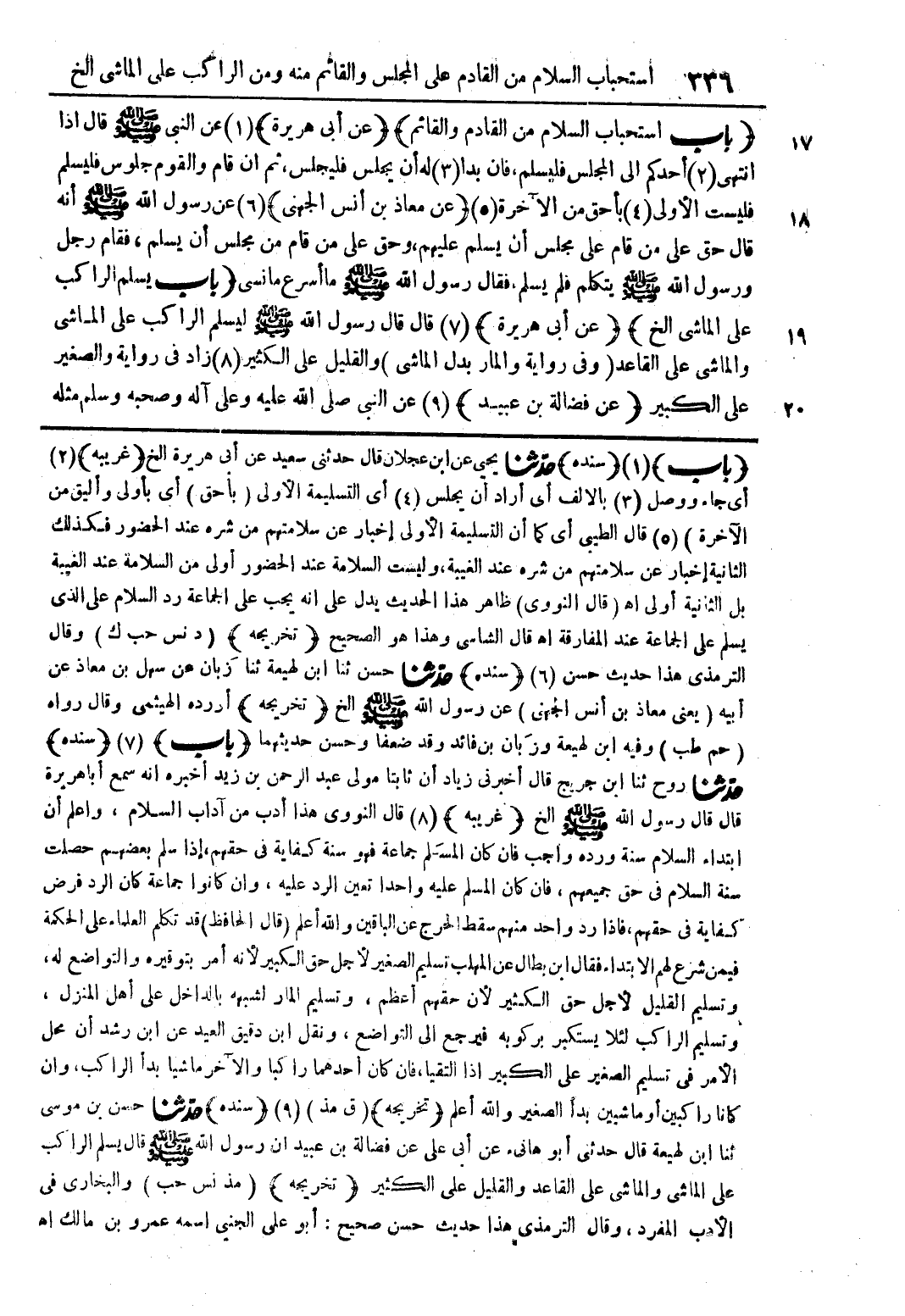 (باب) (1) (سنده) حدثنا يحيى عن ابن عجلان قال حدثني سعيد عن أبي هريرة الخ (غريبه) (2) أي جاء ووصل (3) بالألف أي أراد أن يجلس (4) أي التسليمة الأولى (بأحق) أي بأولى وأليق من الآخر (5) قال الطيبي أي كما أن التسليمة الأولى إخبار عن سلامتهم من شره عند الحضور فكذلك الثانية إخبار عن سلامتهم من شره عند الغيبة، وليست السلامة عند الحضور أولى من السلامة عند الغيبة بل الثانية أولى اهـ (قال النووي) ظاهر هذا الحديث يدل على أنه يجب على الجماعة رد السلام على الذي يسلم على الجماعة عند المفارقة أهـ قال الشامي وهذا هو الصحيح (تخرجه) (د نس حب ك) وقال الترميذي هذا حديث حسن (6) (سنده) حدثنا حسن ثنا ابن لهيعة ثنا زبان عن سهل بن معاذ عن أبيه (يعني معاذ بن أنس الجهني) عن رسول الله صلى الله عليه وسلم الخ (تخريجه) أورده الهيثمي وقال رواه (حم طب) وفيه ابن لهيعة وبان بن فائدة ضعفًا وحسن حديثهما (باب (7) (سنده) حدثنا روح ثنا ابن جريح قال أخبرني زياد أن ثابتا مولى عبد الرحمن بن زيد أخبره أنه سمع أبا هريرة قال قال رسول الله صلى الله عليه وسلم الخ (غريبه) (8) قال النووي هذا أدب من آداب السلام، وأعلم أن ابتداء السلام سنة ورده واجب فإن كان المسلم جماعة فهو سنة كفاية في حقهم، إذا سلم بعضهم حصلت سنة السلام في حق جميعهم، فإن كان المسلم عليه واحدًا تعين الرد عليه، وإن كانوا جماعة كان الرد فرض كفاية في حقهم، فإذا رد واحد منهم سقط الحرج عن الباقين والله اعلم (قال الحافظ) قد تكلم العلماء على الحكمة فيمن شرع لهم الابتداء. فقال ابن بطال عن المهاب تسليم الصغير لأجل حق الكبير؛ لأنه أمر بتوفيره والتواضع له، وتسليم القليل لأجل حق الكثير؛ لأن حقهم أعظم وتسليم المار لشبهه بالداخل على أهل المنزل، وتسليم الراكب لئلا يستكبر بركوبه فيرجع إلى التواضع، ونقل ابن دقيق العيد عن ابن رشد أن محل الأمر في تسليم الصغير على الكبير إذا التقيا، فإن كان أحدهما راكبًا والآخر ماشيًا بدأ الراكب، وأن كانا راكبين أو ماشيين بدأ الصغير والله أعلم (تخريجه) (ق مذ) (9) (سنده) حدثنا حسن بن موسى ثنا ابن لهيعة قال حدثني أبو هاني، عن أبي علي عن فضالة بن عبيد أن رسول الله صلى الله عليه وسلم قال يسلم الراكب على الماشي والماشي على القاعد والقليل على الكثير (تخريجه) (مذ نس حب) والبخاري في الأدب المفرد، وقال الترمذي هذا حديث حسن صحيح: أبو علي الحني اسمه عمرو بن مالك اهـ