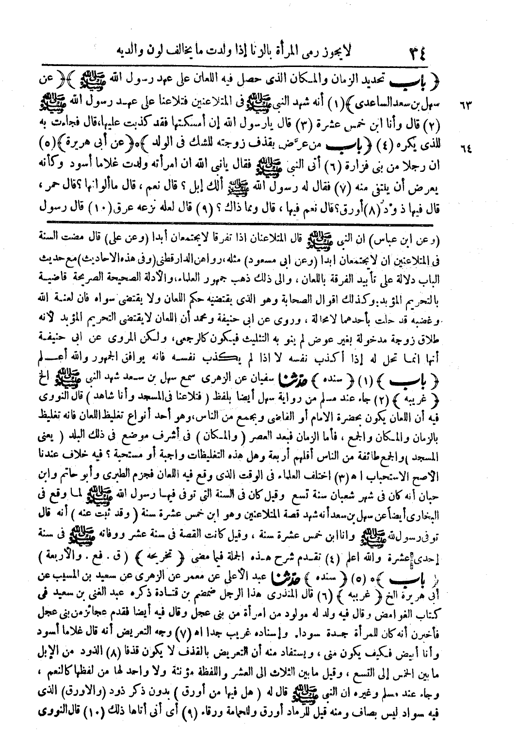 (وعن ابن عباس) ان النبى صلى اللة علية وسلم قال المنتلاعنان اذا تفرقا لا يجتمعان ابدا (وعن على) قال مضت السنة فى المتلاعنين ان يجتمعان ابدا (وعن ابى مسعود) مثلة رواهن الدارقطنى (وفى هذه الاحاديث) مع حديثة الباب دلالة على تايد الفرقة باللعان والى ذلك ذهب جمهور العلماء والادلة الصحيحة الصريحة قاضية بالتحريم الموبد: وكذلك اقوال الصحابة وهو الذى يقتضية حكم اللعان ولا يقتضى سواه فان لعنة اللة وغضبة قد حلت باحداهما لا محالة وروى عن ابن حنيفة ومحمد ان اللعان لا يقتضى التحريم الموبد لانة طلاق زوجة مدخولة بغير عوض لم ينو بة التلبيث فيكون كالرجعى ولكن المروى عن ابى حنيفة انها انما تحل لة اذا اكذب نفسة لا اذا لم يكذب نفسة فانة يوافق الجمهور واللة اعلم (باب) (1) (سندة) حدثنا سفيان عن الزهرى سمع سهل بن سعد شهد النبى صلى اللة علية وسلم الخ (غريبة) (2) جاء عند مسلم من رواية سهل ايضا بلفظ (فتلاعنا فى المسجد وانا شاهد) قال النووى فية ان اللعان يكون بحضرة الامام او القاضى وبجمع من الناس وهو احد انواع تغليظ اللعان فانة تغليظ بالزمان والمكان والجمع فاما الزمان فبعد العصر (والمكان) فى اشرف موضع فى ذلك البلد (يعنى المسجد) والجمع طائفة من الناس اقلهم اربعة وهل هذه التغليظات واجبة او مستحبة؟ فية لاف عندنا الاصح الاستحباب اه (3) اتلف العلماء فى الوقت كان فى السنة التى توفى فيها رسول اللة صلى اللة علية وسلم لما وقع فى البارى ايضا عن سهل بن سعد انة شهد قصة المتلاعينين وهو ابن خمس عشرة سنة (وقد ثبت عنة) انة قال توفى رسول اللة صلى اللة علية وسلم واناابن خمسة عشره سنة وقيل كانت القصة فى سنة عشر ووفاتة صلى اللة علية وسلم فى سنة احدى عشرة واللة اعلم (4) تقدم شرح هذه الجملة فيما مضى (تخريجة) (ق. فع. والاربعة) (باب) (5) (سندة) حدثنا عبد الاعلى عن معمر عن الزهرى عن سعيد بن المسيب عن ابى هريرة الخ (غريبة) (6) قال المنذرى هذا الرجل ضمضم بن قتادة ذكرة عبد الغنى بن سعيد فى كتاب الغوامض وقال فية ولد لة مولود من امراتة من بنى عجل وقال فية ايضا فقدم عجائز من بنى عجل فاخبرن انة كان للمراه جدة سوداء واسنادة غريب جدا اه (7) وجة التعريض انة قال غلاما اسود وانا ابيض فكيف يكون منى ويستفادة منة ان التعريض بالقذف لا يكون قذفا (8) الذود من الابل ما بين المس الى تسع وقيل ما بين الثلاث الى العشر واللفظة مونثة ولا واحد لها من لفظها كالنعم وجاء عند مسلم وغيرة ان النبى صلى اللة علية وسلم قال لة (هل فيها من اورق) بدون ذكر ذود (والاورق) الذى فية سواد ليس بصاف ومنة قيل للرماد اورق وللحمامة ورقاه (9) اى انى اتاها ذلك (10) قال النووي