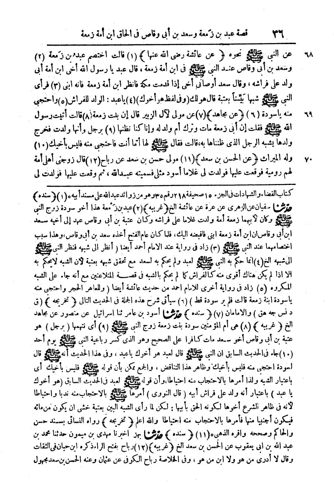 كتاب القضاء والشهادات فى الجزء 15 صحيفى 218 رقم 35 وهو من زوائد عبد اللة على سند ابية * (1) (سندة) حدثنا سفيان عن الزهرى عن عرة عن عائشة ال (غريبة) (2) عبد بن زمعة هذا او سودة زوج النبى صلى اللة علية وسلم وكان لابيها زمعة امة زلدت غلاما على فراشة وكان عتبة بن ابى وقاص عهد الى اخية سعد ابن ابى وقاص ان ابن امة زمعة ابنى فاقبضة اليك فلما كان عام الفتح اخذه سعد بن ابى وقاص وهذا سبب اختصامهما عند النبى صلى اللة علية وسلم (3) زاد فى رواية عند الامام احمد ايضا (انظر الى شبهه فنظر النبى صلى اللة علية وسلم الى شبهة ال (4) انما حكم بة النبى صلى اللة علية وسلم لعبد ولم يحكم بةة لسعد مع تحقيق شبهة بعتبة لان الشبة لا يحكم بة الا اذا لم يكن هناك اقوى منة كالفراش كما لم يحكم بالشبة فى قصة المتلاعنين مع انة جاء على الشبة المكروة (5) زاد فى رواية اخرى للامام احمد نم حديث عائشة ايضا (وللعاهر الحجر واحتجى منة ياسودة ابنة زمعة قالت فلم ير سوده فقط) (6) سياتى شرح هذه الجملة فى الحديث التالى (تخريجة) (ق د نس جة هق) والالامامان 0 7) (سندة) حدثنا اسود بن عامر ثنا اسرائيل عن منصور عن مجاهد الخ (غريبة) (8) هى ام المؤمنين سودة بنت زمعة زوج النبى صلى اللة علية وسلم (9) اى نتهمها (برجل) هو عتبة بن ابى وقاص او سعد مات كافرا على الصحيح وهو الذى كسر رباعية النبى صلى اللة علية وسلم يوم احد (10) جاء فى الحديث السابق ان النبى صلى اللة علية وسلم قال لعبد هو اخوك ياعبد وفى الحديث انة صلى اللة علية وسلم قال لسودة احتجى منة فليس باخيك وظاهر هذا التناقض والجمع ممكن بان قولة صلى اللة علية وسلم فليس باخيك اى باعتبار الشبة ولذا امرها بالاحتجاب منة احتياطا وان قولة صلى اللة علية وسلم لعبد فى الحديث السابق (هو اخوك يا عبد) باعتبار الشبة ولذا امرها بالاحتجاب منة احتياطا وان قولة صلى اللة علية وسلم لعبد فى الحديث السابق (هو اخوك ياعبد) باعتبار انة ولد على فراش ابية (قال النووى) امرها صلى اللة علية وسلم بالاحتجاب منة ندبا واحتياطا لانة فى ظاهر الشرع اخوها لكونة الحق بابيها: لكن لما راى الشبة البين بعتبة خشى ان يكون من مائة فيكون اجنبيا منها فامرها بالاحتجاب منة احتياطا واللة اعلم (تخريجة) رواه النسائى بسند حسن والحاكم وصححة واقراه الذهبى * (11) (سندة) حدثنا بهز اخبرنا مهدى بن ميمون حدثنا محمد بن عبد اللة بن ابى يعقوب عن الحسن بن سعد الخ (غريبة) (12) رباح بفتح الراء ذكرة ابن حبان فى الثقات وقال لا ادرى من هو ولا ابن من هو وفى الخلاصة رباح الكوفى عن عثمان وعنة الحسن بن سعد مجهول