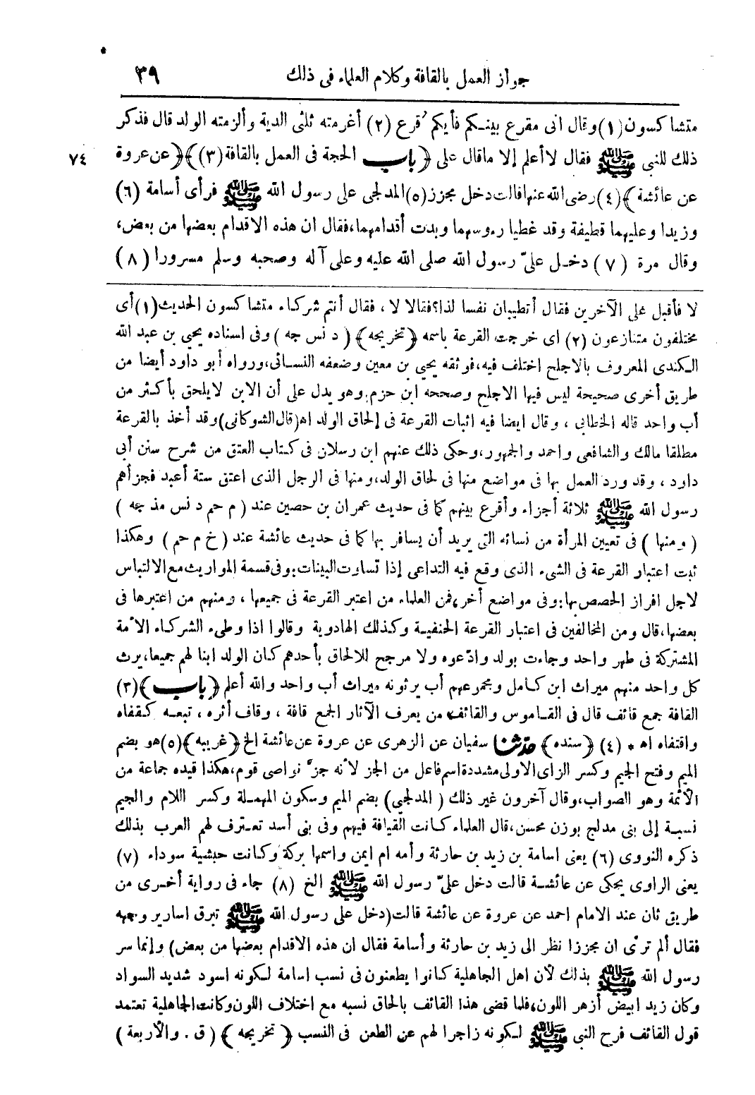 لا فأقبل على الآخرين فقال أتطيبان نفساً لذا؟ فقالا لا، فقال أنتم شركاء متشاكسون الحديث (1) أي مختلفون متنازعون (2) اى خرجت القرعة باسمة (تخريجة) (د نس جة) وفى اسنادة يحيى بن عبد اللة الكندى المعروف بالاجلح اختلفت فية فوثقة يحيى بن معين وضعفة النسائى ورواه ابو داود ايضا من طريق اخرى صحيحة ليس فيها الاجلح وصححة ابن حزم وهو يدل على ان الابن لا يلحق باكثر من اب واحد قالة الخطابى وقال ايضا فية اثبات القرعة فى الحاق الولد اه (قال الشوكانى) وقد اخذ بالقراعة مطلقا مالك والشافعى واحمد والجمهور وحكى ذلك عنهم ابن رسلان فى كتاب العتقمن شرح سنن ابى داود وقد ورد العمل بها فى مواضع منها فى لحاق الولد ومنها فى الرجل اعتق ستة اعبد فجزاهم رسول اللة صلى اللة علية وسلم ثلاثة اجزاء واقرع بينهم كما فى حديث عمران بن حصين عند (م حم د نس مذجة) (ومنها) فى تعيين المراه من نسائة التى يريد ان يسافر بها كما فى حديث عائشة عند (خ م حم) وهكذا ثبت اعتبار القرعة فى الشئ الذى وقع فية التداعى اذا تساوت البينات وفى قسمة المواريث مع الالتباس لاجل افراز الحصص بها وفى مواضع اخر فمن العلماء من اعتبر القرعة فى جميعها ومنهم من اعتبرها فى بعضها قال ومن المخالفين فى اعتبار القرعة الحنفية وكذلك الهادوية وقالوا اذا وطئ الشركاء الامة المشركة فى طهر واحد وجاءت بولد وادعوة ولا مرجع للالحاق باحدهم كان الولد ابنا لهم جميعا يرث كل واحد منهم ميراث ابن كامل ومجموهم اب يرثونة ميراث اب واحد واللة اعلم (باب) (3) القافة جمع قائف قال القاموس والقائف من يعرف الاثار الجمع قافة وقاف اثرة تبعة كقفاء واقتفاة اه (4) (سندة) حدثنا سفيان عن الزهرى عن عروة عن عائشة ال (غريبة) (5) هو بضم الميم وفتح الجيم وكسر الزاى الاولى مشددة اسم فاعل من الجز لانة جز نواصى قوم هطذا قيدة جماعة من الائمة وهو الصواب وقال آخرون غير ذلك (المدلجى) بضم الميم وسكون المهملة وكسر اللام والجيم نسبة الى بنى مدلج بوزن محسن قال العلماء كانت القيافة فيهم وفى بنى اسد تعترف لهم العرب بذلك ذكرة النووى (6) يعنى اسامة بن زيد بن حارثة وامة ام ايمن واسمها بركة وكانت حبشية سوداء (7) يعنى الراوى يحكى عن عائشة قالت (دخل على رسول اللة صلى اللة علية وسلم تبرق اسارير وجهة فقال الم ترى ان مجززا نظر الى زيد بن حارثة واسامة فقال ان هذة الاقدام بعضها من بعض) وانما سر رسول اللة صلى اللة علية وسلم بذلك لان اهل الجاهلية كانوا يطعنون فى نسب اسامة لكونة اسود شديد السواد وكان زيد ابيض ازهر اللون فلما قضى هذا القائف بالحاق نسبة مع اختلاف اللون وكانت الجاهلية تعتمد قول القائف فرح النبى صلى اللة علية وسلم لكونة زاجر لهم عن الطعن فى النسب (تخريجة) (ق. والأربعة)