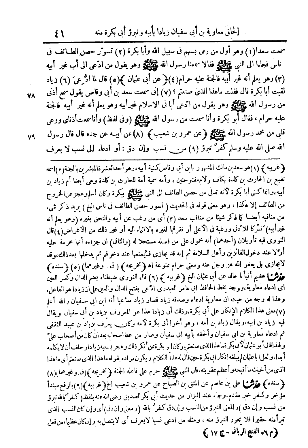 (غريبه) (1) هو سعد بن مالك المشهور بابن ابى وقاص كنية ابية وهو احد العشرة المبشرين بالجنة (2) اسمة نفيع بن حارث بن كلدة بكاف ولام مفتوحتين وامة سمية امة للحارث بن كلدة وهى ايضا ام زياد بن ابية وانما كنى ابا بكرة لانة تدلى من حصن الطائف الى النبى صلى اللة علية وسلم ببكرة وكان اسم وعجز عن الخروج من الطائف الى هكذا وهو معنى قولى فى الحديث (تسور حصن الطائف فى ناس الخ) يريد ذكر شيئا من مناقب سعد (2) اى من رغب عن ابية والتحقق بغيرة (وهو يعلم انة غير ابية) تسركا للادنى ورغبة فى الاعلى او تقريبهما لغيرة بالانتماء الية او غير ذلك من الاعراض (4) قال النووى فية تأويلان (احداهما) انة محمول على من فعلة مستحيلا لة (والثانى) ان جزاءة انها محرمة علية اولا عند دخول الفائزينواهل السلامة ثم انة قد يجارى فيمنعها عند دخولهم ثم يدخلها بعد ذلك وقد لا يجازى بل يعفو اللة عز وجل عنة ومعنى حرام ممنوعة اه (تخريجة) (ق. وغيرهما (5) (سندة) حدثنا هشيم انبانا خالد عن ابى عثمان الخ (غريبة) (6) قال النووى ضبطناه بضم الدال وكسر العين اى ادعاه معاوية وجد بخلط الحافظ ابى عامر العبدرى ادعى بفتح الدال والعين على ان زيادا هو الفاعل وهذاا لة وجة من وحيث ان معاوية ادعاه وصدقة زيادة مدعيا انة ابن ابى سفيان واللة اعلم (7) معنى هذا الكلام الانكار على ابى بكرة وذلك ان زيادا هذا هو المعروف بزياد بن ابى سفيان ويقال فية زيادة بن ابية ويقال زيادة بن امية وهو اوا ابى بكرة لامة وكان يعرف بزيادة بن عبيد الثقفى ثم ادعاه معاوي بن ابى سفيان والحقة بابية ابى سفيان وصار من جملة اصحابة بعد ان كان من اصحاب على ولهذا قال ابو عثمان لابى بكرة ما هذا الذى صنعتم: وكان ابو بكرة ممن انكر ذلك هجر بسببة زيادا وحلف ان لا يكلمة ابدا ولعل ابا عثمان لم يبلغة انكار ابى بكرة حين قال هذا الكلام ويكون مرادة بقولة ما هذا الذى صنعتم اى ما هذا الذى من اخيك ما اقبحة واعظم عقوبتة فان النبى صلى اللة علية وسلم حرم على فاعلة الجنة (تريجة) (ق. وغيرهما) (8) (سندة) حدثنا على بن عاصم عن المثنى بن الصباح عن عمرو بن شعيب الخ (غريبة) (9) بالرفع ميتدا مؤر وكفر خبر مقدم وجاء عند البزار من حديث ابى بكر الصديق رضىللة عنة بلفظ (كفر باللة تبرؤ من نسب وان دق) والمعنى التبرؤ من النسب وان دق كفر باللة (ومعنى وان دق) اى وان كان النسب الذى تبرأمنة حقيرا فلا يجوز التبرؤ منة ومثلة من ادعى نسبا لا يعرف اى لا يتصل بة وان كان عظيما من فعل
