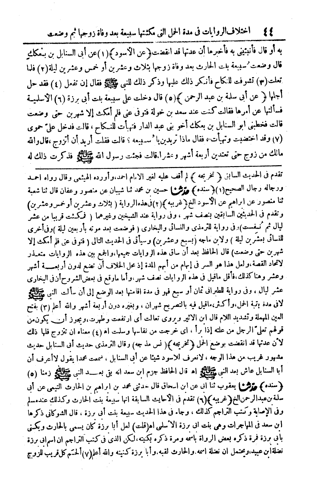 تقدم في الحديث السابق (تخريجة) لم اقف علية لغير الامام احمد واوردة الهيثمى وقال رواه احمد ورجالة رجال الصحيح (1) (سندة) حدثنا حسين بن محمد ثنا شيبان عن منصور وعفان قال ثنا شعبة ثنا منصور عن ابراهيم عن الاسود ال (غريبة) (2) فى هذه الرواية (بثلاث وعشرين او خمس وعشرين) وتقدم فى الحديثين السابقين بنصف شهر وفى رواية عند الشيخين وغيرهما (فمكثت قريبا من عشر ليال ثم نفست) وفى رواية للترمذى والنسائى والبارى (فوضعت بعد موتة باربعين ليلة) وفى ارى للنسائى بعشرين ليلة) ولابن ماجة (بسبع وعشرين) وسياتى فى الحديث التالى (فتوفى عنى فلم امكث الا شهرين حتى وضعت) قال الحافظ بعد ان ساق هذة الرويات جميعها والجمع بين هذة الرويات متعذر لاتحاد القصة وامل هذا هو السر فى ابهام المدة اذا محل اللاف ان تضع لدون اربعة اشهر وعشر ليال وفى رواية للطبرانى ثمان او سبع فهو فى مدة اقامتها بعد الوضع الى ان سالت النبى صلى اللة علية وسلم لانى مدة بقية الحمل واكثرها ما قيل فية بالتصريح شهران وبغيرة دون اربعة اشهر واللة اعلم (3) بفتح العين المهملة وتشديد اللام قال ابن الاثير ويروى تعالت اى ارتفعت وطهرت ويجوز ان يكون من قولهم تعلى الرجل من علتة اذا برأ اى رجت من نفاسها وسلت اه (4) معناه ان تتزوج فلها ذلك لان عدتها قد انقضت بوضع الحمل (تخريجة) (نس مذ جة) وقال الترمذى حديث ابى السنابلل حديث مشهور غريب من هذا الوجة لا نعرف للاسود شيئا عن ابى السنابل سمعت محمدا يقول لا اعرفان ابا السنابل عاش بعد النبى صلى اللة علية وسلم اه قال الحافظ جزم ابن سعد انة بقى بعد النبى صلى اللة علية وسلم زمنا (5) (سندة) حدثنا يعقوب ثنا ابى عن ابن اسحاق قال حدثنى محمد بن ابراهيم بن الحارث وكذلك عند مسلم وفى الاصابة وكتب التراجم كذلك وجاء فى هذا الحديث سبيعة بنت ابى برزة قال الشوكانى ذكرها ابن سعد فى المهاجرات وهى بنت ابى برزة الاسلى اه (قلت) لعل ابا برزة كان يسمى بالحارث ويكنى بابى برزة فمرة ذكرة بعض الرواة باسمة ومرة ذكرة بكنيتة لكن الذى فى كتب التراجم ان اسم ابى برزة نضلة ابن عبيد ويحتمل ان نضلة اسمة والحارث لقبة وابا برزة كنيتة واللة اعلم (7) الحم كل قريب للزوج