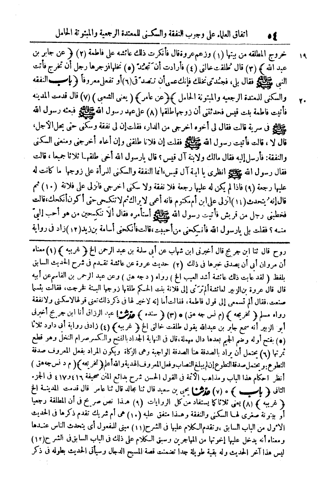 روح قال ابن جريح قال اخبرنى ابن شهاب عن ابى سلمة بن عبد الرحمن الخ (غريبة) (1) معناه ان مروان ابى ان يصدق خبرها فى ذلك (2) حديث عروة عن عائشة تقدم فى شرح السابق بلفظ (لقد عابت ذلك عائشة اشد العيب الخ) رواه (دجة هق) وعن عبد الرحمن بن القاسم عن ابية قال قال عروة بن الزبير لعائشة الم ترى الى فلانة بنت الحكم طلقها زوجها البتة فخرجت فقالت بئسما صنعت فقال الم تسمعى الى قول فاطمة فقالت اما انة لا خير لها فى ذكر ذلك تعنى قولها لا سكنى ولا نفقة رواه مسلم (تخريجة) (م نس جة هق) * (3) (سندة) حدثنا عبد الرزاق انا ابن جريج اخبرنى ابو الزبير انة سمع جابر بن عبد اللة يقول طلقت خالتى الخ (غريبة) (4) زاد فى رواية ابى داود ثلاثا (5) بفتح اولة وضم الجيم بعدها دال مهملة قال فى النهاية الجداد بالفتح والكسر صرام النخل وهو قطع ثمرتها (6) يحتمل ان يراد بالصدقة هنا الواجبة وهى الزكاه ويكون المراد بفعل المعروف صدقة التطوع ويحتمل صدقة التطوع ان لم يبلغ النصاب وفعل المعروف الهدية واللة اعلم (تخريجة) (م د نس جة هق) انظر احكام هذا الباب ومذاهب الائمة فى القول الحسن شرح بدائع المنن صحيفة 416 و 417 فى الجزء الثانى (باب) (7) حدثنا يحيى بن سعيد قال ثنا مجالد قال ثنا عامر قال قدمت المدينة الخ (غريبة) (8) يعنى ثلاثا كما يستفاد من كل الروايات (9) هذا نص صريح فى ان المطلقة رجعيا او بينونة صغرى لها السكنى والنفقة وهذا متفق علية (10) هى ام شريك تقدم ذكرها فى الحديث الاول من الباب السابق وتقدم الكلام عليها فى الشرح (11) مبنى للمفعول اى يتحدث الناس عندها ومعناه انة يدخل عليها اخواتها من المهاجرين وسبق الكلام على ذلك فى الباب السابق فى الشرح (12) ليس هذا اخر الحديث ولة بقية طويلة جدا تضمنت قصة المسيح الدجال وسياتى الحديث بطولة في ذكر