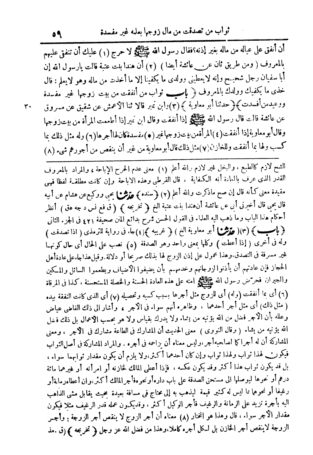الشح لازم كالطبع والبخل غير لازم واللة اعلم (1) معنى عدم الحرح الاباحة والمراد بالمعروف القدر الذى عرف بالمادة انة الكفاية قال القرطىةهذة الاباحة وان كانت مطلقة لفظا فهى مقيدة معنى كانة قال ان صح ما ذكرت واللة اعلم (2) (سنده) حدثنا يحيى ووكيع عن هشام عن ابية قاليحيى قال ابرنى ابى عن عائشة ان هندا بنت عتبة الخ (تخريجة) (ق فع نس د جة هق) انظر احكام هذا الباب وما ذهب الية العلماء فى القول الحسن شرح بدائع المنن صحيفة 421 فى الجزء الثانى (باب) (3) (حدثنا ابو معاوية الخ) (غريبة) (4) جاء فى رواية للترمذى (اذا تصدقت) ولة فى ارى (اذا اعطيت) وكلها بمعنى واحد وهو الصدقة (5) نصب على الحلال اى حال كونها غير مسرفة فى التصدق وهذا محمول على اذن الزوج لها بذلك صريحا او دلالة وقيل هذا جاء على عادة اهل الحجاز فان عادتهم ان يأذنوا لزوجاتهم وخدمهم بان يضيفوا الاضياف ويطعموا السائل والمسكين والجيران فحرض رسول اللة صلى اللة علية وسلم امتة على هذة العادة الحسنة والخصلة المستحسنة كذا فى الرقاه (6) اى بما انفقت (ولة) اى للزوج مثل اجرها بسبب كسبة وتحصيلة (7) اى الذى كانت النفقة بيدة (مثل ذلك) اى مثل اجر احدهما وظاهرة انهم سواء فى الاجر واشار الى ذلك القاضى عياض وعللة بان الاجر فضل من اللة يؤتية من يشاء ولا يدرك بقياس ولا هو بحسب الاعمال بل ذلك فضل اللة يؤتية من يشاء (وقال النووى) معنى الحديث ان المشارك فى الطاعة مشارك فى الاجر ومعنى المشاركة ان لة اجرا كما لصاحبة اجر وليس معناه ان يزاحمة فى اجرة والمراد المشاركة فى اصل الثواب فيكون لهذا ثواب ولهذا ثواب وان كان احدهما اكثر ولا يلزم ان يكون مقدار ثوابها سواء بل قد يكون ثواب هذا اكثر وقد يكون عكسة فاذا اعطى المالك لخازنة او امراتة او غيرهما مائة درهم او نحوها ليوصلها الى مستق الصدقة على باب دارة او نحوة فاجر المالك اكثر وان اعطاه رمانة او رغيفا او نحوهما مما ليس لة كثير قيمة ليذهب بة الى محتاج فى مسافة بعيدة بحيث يقابل مشى الذاهب الية باجرة تزيد على الرمانة والرغيف فاجر الوكيل اكثر وقد يكون عملة قدر الرغيف مثلا فيكون مقدار الاجر سواء قال وهذا هو المختار (8) معناه ان اجر الزوج لا ينقص اجر الزوجة: واجر الزوجة لا ينقص الخازن بل لكل اجرة كاملا وهذا من فضل اللة عز وجل (تخريجة) (ق. مذ