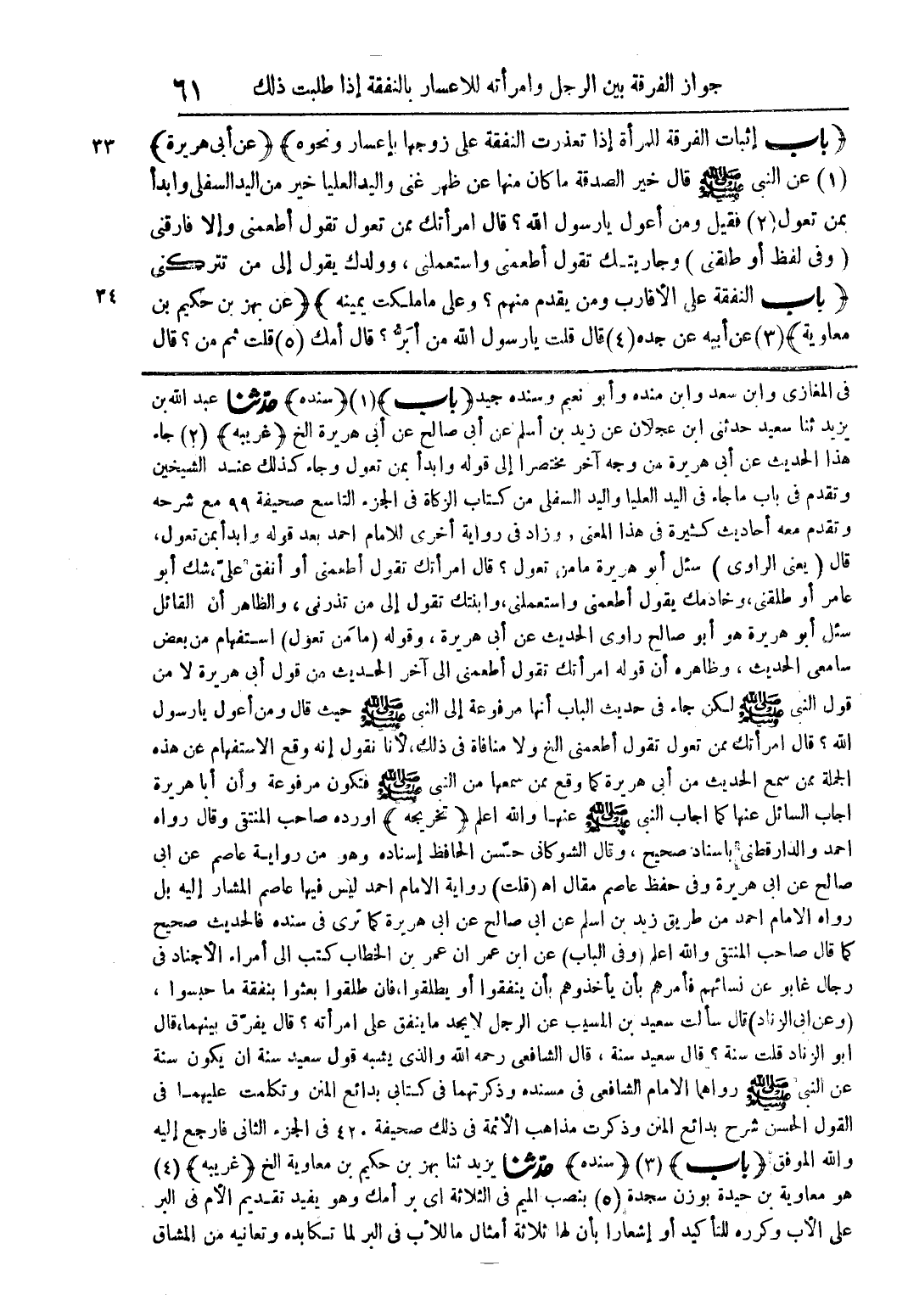 (باب إثبات الفرقة للمرأة إذا تعذرت النفقة على زوجها بإعسار ونحوه) (عن أبي هريرة) عن النبي صلى الله عليه سولم قال خير الصدقة ما كان منها عن ظهر غني واليد العليا خير من اليد السفلى وابدأ بمن تعول فقيل ومن أعول يا رسول الله؟ قال امرأتك ممن تعول تقول أطعمني وإلا فارقني (وفي لفظ أو طلقني) وجاريتك تقول أطعمني واستعملني، وولدك يقول إلى من تتركني (باب النفقة على الأقارب ومن يقدم منهم؟ وعلى ما ملكت يمينه) (عن بهز بن حكيم بن معاوية) عن أبيه عن جده قال قلت يا رسول الله من أبر؟ قال أمك قلت ثم من؟ قال