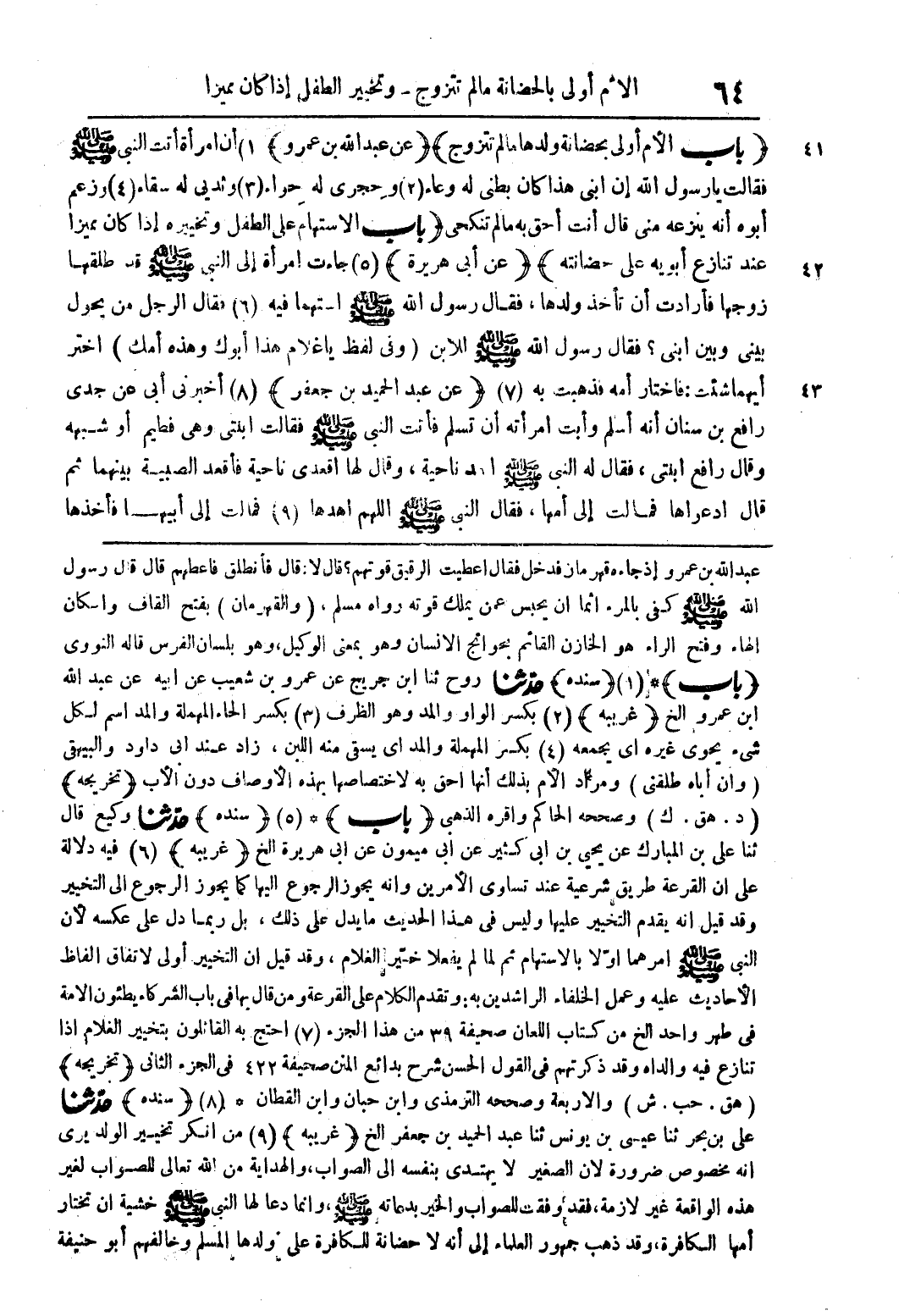 (باب الأم أولى بحضانة ولدها ما لم تتزوج) (عن عبد الله بن عمرو) أن امرأة أتت النبي صلى الله عليه وسلم فقالت يا رسول الله إن ابني هذا كان بطني له وعاء وحجري له حواء وثديي له سقاء وزعم أبوه أنه ينزعه مني قال أنت أحق به ما لم تنكحي (باب الاستهام على الطفل وتخييره إذا كان مميزا عند تنازع أبويه على حضانته) (عن أبي هريرة) جاءت امرأة إلى النبي صلى الله عليه وسلم قد طلقها زوجها فأرادت أن تأخذ ولدها، فقال رسول الله صلى الله عليه وسلم استهما فيه فقال الرجل من يحول بيني وبين ابني؟ فقال رسول الله صلى الله عليه وسلم للابن (وفي لفظ يا غلام هذا أبوك وهذه أمك) اختر أيهما شئت: فاختار أمه فذهبت به (عن عبد الحميد بن جعفر) أخبرني أبي عن جدي رافع بن سنان أنه أسلم وأبت امرأته أن تسلم فأتت النبي صلى الله عليه وسلم فقالت ابنتي وهي فطيم أو شبهه وقال رافع ابنتي، فقال له النبي صلى الله عليه وسلم اقعد ناحية، وقال لها اقعدي ناحية فأقعد الصبية بينهما ثم قال ادعواها فمالت إلى أمها، فقال النبي صلى الله عليه وسلم اللهم اهدها فمالت إلى أبيها فأخذها