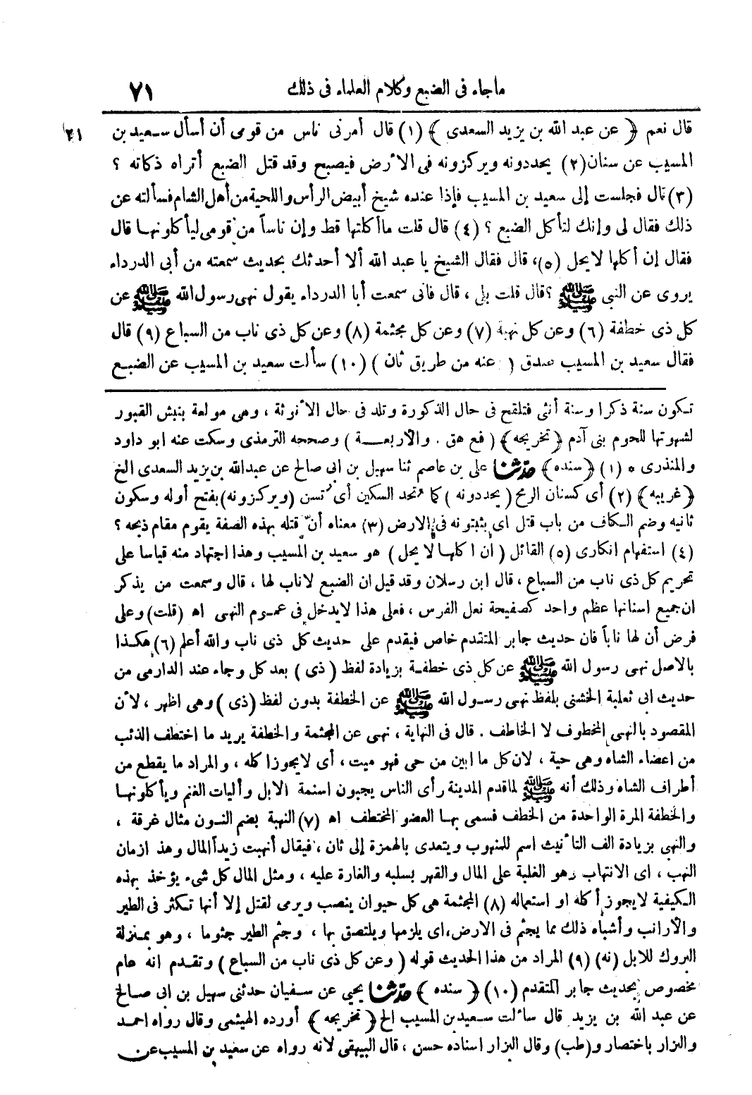 قال نعم (عن عبد الله بن يزيد السعدي) قال أمرني ناس من قومي أن أسأل سعيد بن المسيب عن سنان يحددونه ويكزونه في الأرض فيصبح وقد قتل الضبع أتراه ذكاته؟ قال فجلست إلى سعيد بن المسيب فإذا عنده شيخ أبيض الرأس واللحية من أهل الشام فسألته عن ذلك فقال لي وإنك لتأكل الضبع؟ قال قلت ما أكلتها قط وإن ناسًا من قومي ليأكلونها قال فقال إن أكلها لا يحل، قال فقال الشيخ يا عبد الله ألا أحدثك بحديث سمعته من أبي الدرداء يروي عن النبي صلى الله عليه وسلم؟ قال قلت بلى، قال فإني سمعت أبا الدرداء يقول نهى رسول الله صلى الله عليه وسلم عن كل ذي خطفة وعن كل نهبة وعن كل مجثمة وعن كل ذي ناب من السباع قال فقال سعيد بن المسيب صدق (عنه من طريق ثان) سألت سعيد بن المسيب عن الضبع