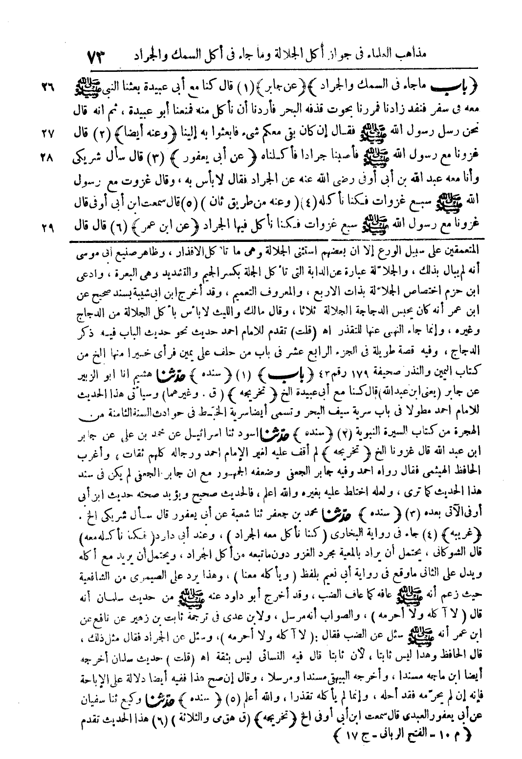 (باب ما جاء في السمك والجراد) (عن جابر) قال كنا مع أبي عبيدة بعثنا النبي صلى الله عليه وسلم معه في سفر فنفد زادنا فمررنا بحوث قذفه البحر فأردنا أن نأكل منه فمنعنا أبو عبيدة، ثم أنه قال نحن رسل رسول الله صلى الله عليه وسلم فقال إن كان بقى معكم شيء فابعثوا به إلينا (وعنه أيضا) قال غزونا مع رسول الله صلى الله عليه وسلم فأصبنا جرادا فأكلناه (عن أبي يعفور) قال سأل شريكي وأنا معه عبد الله بن أبي أوفى رضي الله عنه عن الجراد فقال لا بأس به، وقال غزوت مع رسول الله صلى الله عليه وسلم سبع غزوات فكنا نأكله (وعنه من طريق ثان) قال سمعت ابن أبي أوفى قال غزونا مع رسول الله صلى الله عليه وسلم سبع غزوات فكنا نأكل فيها الجراد (عن ابن عمر) قال قال