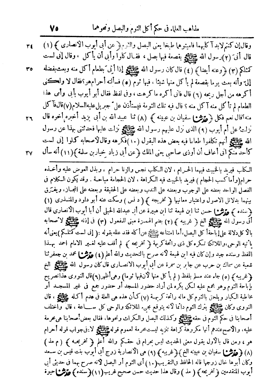 الكلب فيريد بالبيث فيهما الحرام لان الكلب نجس والزنا حرام وبذل العوض علية واخذة حرام (واما كسب الحجام) فيريد بالخبيث فية الكراهية لان الحجامة مباحة وقد يكون الكلام فى الفصل الواحد بعضة على الوجوب وبعضة على الندب وبعضة على الحقيقة وبعضة على المجاز ويفرق بينهما بدلائل الاصول واعتبار معانيها (تخريجة) (د نس) وسكت عنة ابو داود والمنذرى (1) (سندة) حدثنا حسن ثنا ابن لهيعة ثنا ابن هبير عن ابى عبد اللة الخبلى ان ابا ايوب الانصارى قال اتى رسول اللة صلى اللة علية وسلم ال (غريبة) (2) بضم الهمزة مبنى للمفعول (3) فى اذنة صلى اللة علية وسلم لا صحابة بالاكل دلالة على الاباحة اكل البصل اما امتناعة صلى اللة علية وسلم عن اكلة فقد عللة بقولة • انى لست كمثلكم) يعنى انة ياتية الوحى والملائكة تكرة كل ذى رائحة كريهة (تخريجة) لم اقف علية لغير الامام احمد بهذا اللفظ وسندة جيد وان كان فية ابن لهيعة لانة صرح بالتحديث واللة اعلم (4) حدثنا محمد بن جعفر ثنا شعبة عن سماك بن حرب عن جابر بن سمرة عن ابى ايوب الانصارى قال كان رسول اللة صلى اللة علية وسلم الخ (غريبة) (5) جاء عند مسلم بلفظ (لم ياكل منها لان فيها ثوما) وهى اظهر (6) قال النووى هذا تصريح باباحة الثوم وهو مجمع علية لكن يكرة لمن اراد حضور المسجد او حضور جمع فى غير المسجد او مخاطبة الكبار ويلحق بالثوم كل مالة رائحة كريهة (7) كأن هذة هى العلة فى عدم اكلة صلى اللة علية وسلم قال النووى وكان صلى اللة علية وسلم يترك الثوم دائما لانة يتوقع مجئ الملائكة والوحى كل ساعة قال واختلف اصحابنا فى حكم الثوم فى حقة صلى اللة علية وسلم وكذلك البصل والكراث ونحوها فقال بعض اصحابنا هى محرمة علية والاصح عندهم انها مكروة كراهة تنزية ليست محرمة لعموم قولة صلى اللة علية وسلم لا: فى جواب قولة احرام هو ومن قال بالاول يقول معنى الحديث ليس بحرام فى حقكم واللة اعلم (تخريجة) (م مذ) (8) (حدثنا سفيان بن عيينة الخ) (غريبة) (9) هى الانصارية زوج ابى ايوب بنت قيس بن سعد وكان ابوها ال زوجها قالة الحافظ فى التقريب (10) اى الثوم او البصل لانة صرح بهما فى حديثى ابى ايوب المتقدمين (تخريجة) (مذ) وقال هذا حديث حسن صحيح غريب (11) (سندة) حدثنا حيوة