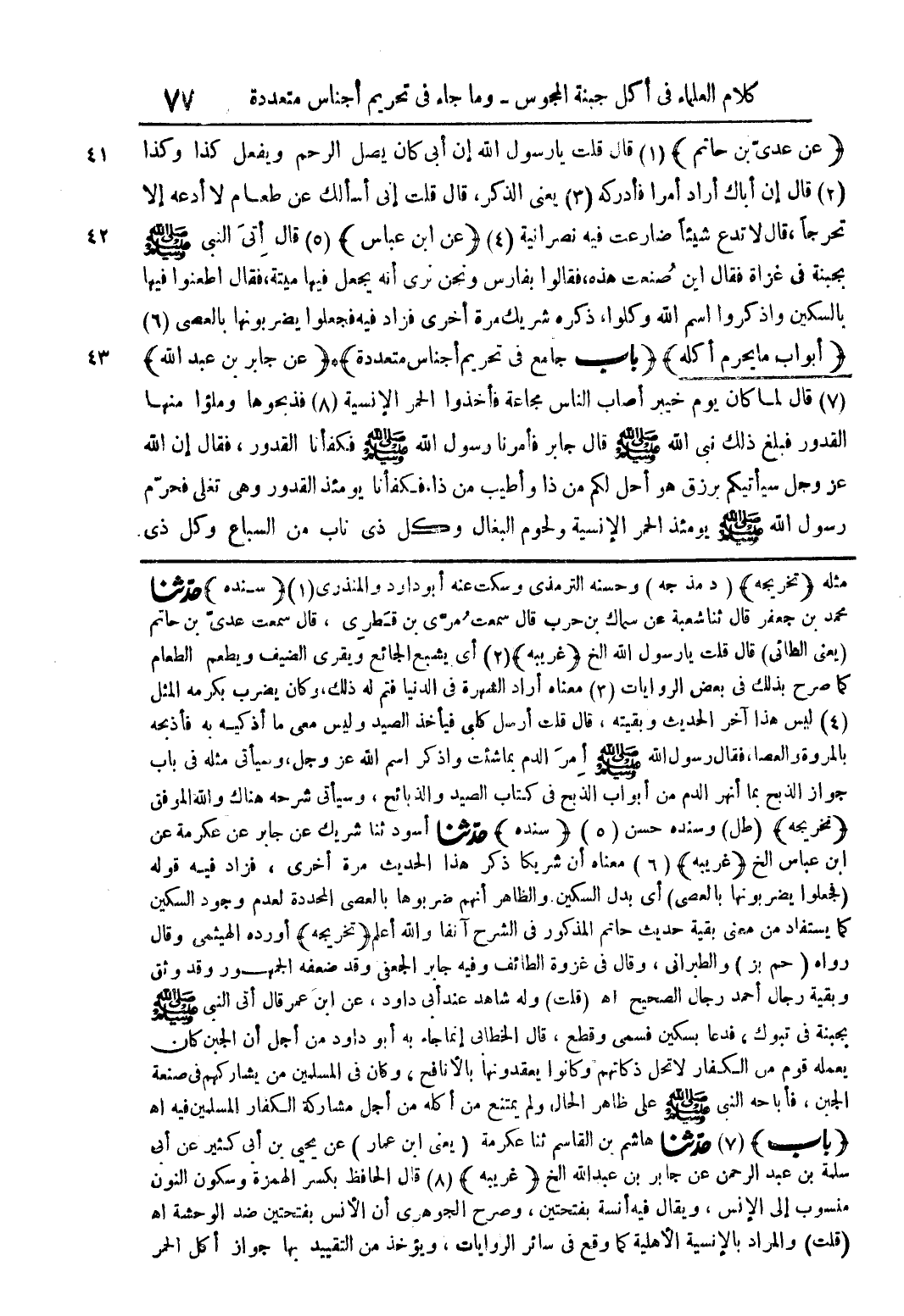 (عن عدي بن حاتم) قال قلت يا رسول الله إن أبي كان يصل الرحمن ويفعل كذا وكذا قال إن أباك أراد أمرا فأدركه يعني الذكر، قال قلت إني أسألك عن طعام لا أدعه إلا تحرجًا، قال لا تدع شيئا ضارعت فيه نصرانية (عن ابن عباس) قال أتى النبي صلى الله عليه وسلم بجبنة في غزاة فقال أين صنعت هذه، فقالوا بفارس ونحن نرى أنه يجعل فيها ميتة، فقال اطعنوا فيها بالسكين واذكروا اسم الله وكلوا، ذكره شريك مرة أخرى فزاد فيه فجعلوا يضربونها بالعصى (أبواب ما يحرم أكله) (باب جامع في تحريم أجناس متعددة) (عن جابر بن عبد الله) قال لما كان يوم خيبر أصاب الناس مجاعة فأخذوا الحمر الإنسية فذبحوها وملؤا منها القدور فبلغ ذلك نبي الله صلى الله عليه وسلم قال جابر فأمرنا رسول الله صلى الله عليه وسلم فكفأنا القدور، فقال إن الله عز وجل سيأتيكم برزق هو أحل لكم من ذا وأطيب من ذا فكفأنا يومئذ القدور وهي تغلى فحرم رسول الله صلى الله عليه وسلم يومئذ الحمر الإنسية ولحوم البغال وكل ذي ناب من السباع وكل ذي