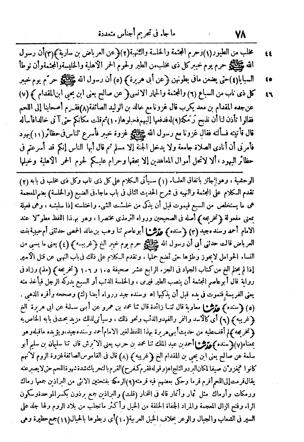مخلب من الطيور وحرم المجثمة والخلسة والنهبة (عن العرباض بن سارية) أن رسول الله صلى الله عليه وسلم حرم يوم خيبر كل ذي مخلب من الطيور ولحوم الحمر الأهلية والخليسة والمجثمة وأن توطأ السبايا حتى يضمن ما في بطونهن (عن أبي هريرة) أن رسول الله صلى الله عليه وسلم حرم يوم خيبر كل ذي ناب من السباع والمجثمة والحمار الأنسي (عن صالح يعني ابن يحيى ابن المقدام) عن جده المقدام بن معد يكرب قال غزونا مع خالد بن الوليد الصائفة قفرم أصحابنا إلى اللحم فقالوا تأذن لنا أن نذبح رمكة له فدفعها إليهم فحبلوها ثم قلت مكانكم حتى آتى خالدا فأسأله قال فأتيته فسألته فقال غزونا مع رسول الله صلى الله عليه وسلم غزوة خيبر فأسرع في حظائر يهود فأمرني أن أنادي الصلاة جامعة ولا يدخل الجنة إلا مسلم ثم قال أيها الناس إنكم قد أسرعتم في حظائر اليهود، ألا لا تحل أموال المعاهدين إلا بحقها وحرام عليكم لحوم الحمر الأهلية وخيلها