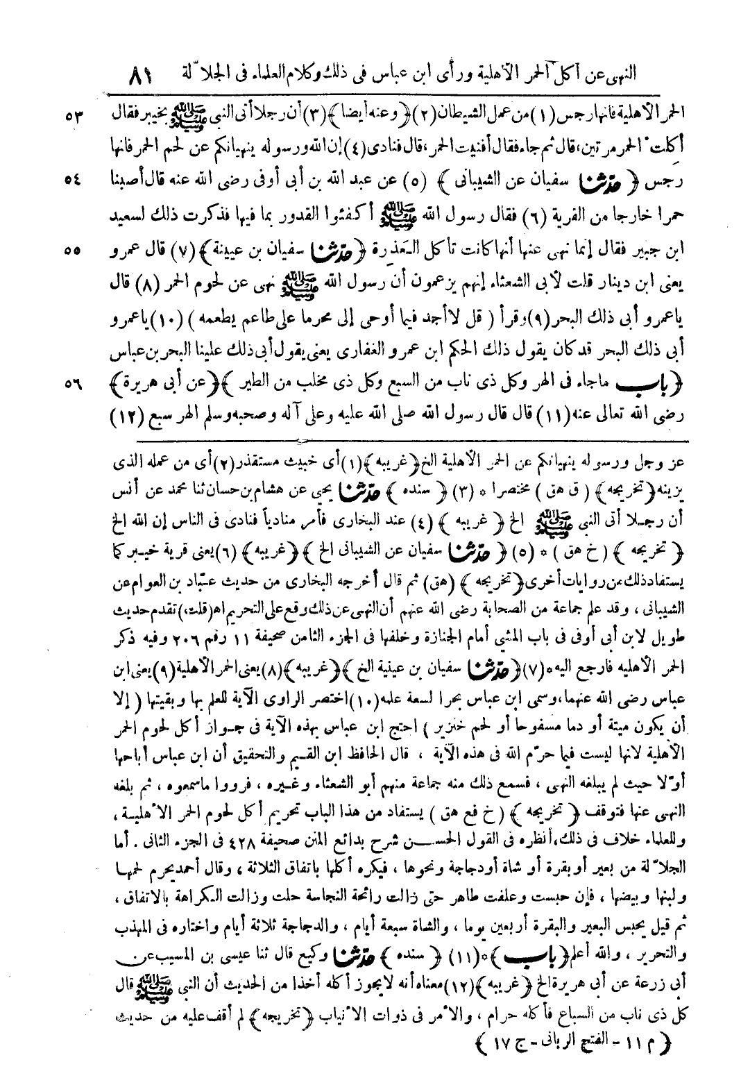 عز وجل ورسوله ينهياكم عن الحمر الاهلية الخ (غريبة) (1) اى خبيث مستقذر (2) اى من عملة الذى يزينة (تخريجة) (ق هق) مختصرا * (3) (سندة) حدثنا يحيى عن هشام بن حسان ثنا محمد عن انس ان رجلا اتى النبى صلى الللة علية وسلم الخ (غريبة) (4) عند البخارى فامر مناديا فنادى فى الناس ان اللة الخ (تخريجة) (خ هق) * (5) (حدثنا سفيان عن السيبانى الخ) (غريبة) (6) يعنى قرية خيبر كما يستفاد ذلك من روايات اخرى (تخريجة) (هق) ثم قال اخرجة البخارى من حديث عباد بن العوام عن الشيبانى وقد علم جماعة من الصحابة رضى اللة عنهم ان النهى عن ذلك وقع على تحريم اه (قلت) تقدم حديث طويل لابن ابى اوفى فى باب المشى امام الجنازة وخلفها فى الجزء الثامن صحيفة 11 رقم 206 وفية ذكر الحمر الاهلية فارجع الية * (7) (حدثنا سفيان بن عينية الخ) (غريبة) (8) يعنى الحمر الاهلية (9) يعنى ابن عباس رضى اللة عنهما وسمى ابن عباس بحرا لسعة علمة (10) اختصرا الراوى الاية للعلم بها وبقيتها (الا ان يكون ميتة او دما مسفوحا او لحم خنزير احتج ابن عباس بهذة الاية فى جواز اكل لحوم الحمر الاهلية لانها ليست فيما حرم اللة فى هذة الاية قال الحافظ ابن القيم والتحقيق ان ابن عباس اباحها اولا حيث لم يبلغة النهى فسمع ذلك منة جماعة منهم ابو الشعثاء وغيرهم فرووا ما سمعوة ثم بلغة النهى عنها فتوقف (تخريجة) (خ فع هق) يستفاد من هذا الباب تحريم اكل لحوم الحمر الاهلية وللعلماء خلاف فى ذلك انظرة فى القول الحسن شرح بدائع المنن صحيفة 428 فى الجزء الثانى اما الجلالة من بعير او بقرة او شاه او دجاجة ونحوها فيكرة اكلها باتفاق الثلاثة وقال احمد يحرم لحمها ولبنها وبيضها فان حبست وعلفت طاهر حتى زالت رائحة النجاسة حلت وزالت الكراهة بالاتفاق ثم قيل يحبس البعير والبقرة اربعين يوما والشاه سبعة ايام والدجاجة ثلاثة ايام واختارة فى المهذب والتحرير واللة اعلم (باب) * (سندة) حدثنا وكيع قال ثنا عيسى بن المسيب عن ابن زرعة عن ابى هريرة الخ (غريبة) (12) معناه انة لا يجوز اكلة اخذا من الحديث ان النبى صلى اللة علية وسلم قال كل ذى ناب من السباع فاكلة حرام والامر فى ذوات الانياب (تخريجة) لم اقف علية من حديث
