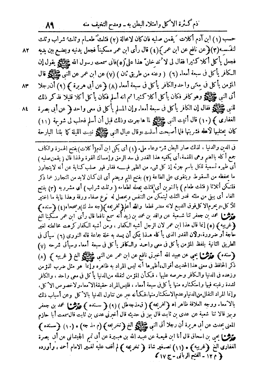 في الدين والدنيا لذلك صار البطن شر وعاء ملئ (1) اى يكفى ابن ادم (اكلات) بفتح الهمزرة والكاف جمع اكلة بالضم وهى اللقمة اى يكفية هذا القدر فى سد المق وامساك القوة ولهذا قال (يقمن صلية) اى ظهرة تسمية للكل باسم جزئة اذا كل شئ من الظهر فية فقار فهو صلب كناية عن انة لا يتجاوز ما يحفظة من السقوط ويتقوى علىلطاعة (2) بفتح الميم ويضم اى ان كان لابد من التجارز عما ذكر فلتكن اثلاثا (فثلث طعاما) بالتنوين اى فثلث يجعلة لطعامة (وثلث شراب) اى مشروبة (3) بفتح الفاء اى يبقى من ملئة قدر الثلث ليتمكن من التنفس ويحصل لة نوع صفاء ورقة وهذا غاية ما اختبر للاكل ويحرم الاكل فوق السبع لانة مضر قطعا واللة اعلم (تخريجة) (جة مذ ك) وصححاه (4) (سندة) حدثنا محمد بن جعفر ثنا شعبة عن واقد بن محمد بن زيد انة سمع نافعا قال راى ابن عمر مسكينا الخ (غريبة) (5) انما قال هذا ابن عمر لان الرجل اشبة الكفار ومن اشبة الكفار كرهت مالطتة لغير حاجة او ضرورة ولان القدر الذى ياكلة هذا يمكن ان يسد بة خلة جماعة قالة النووى (6) سياتى فى الطريق الثانية بلفظ المؤمن ياكل فى معى واحد والكافر ياكل فى سبعة امعاء وسياتى شرحة (7) (سندة) حدثنا يحيى عن عبيد اللة اخبرنى نافع عن ابن عمر عن النبى صلى اللة علية وسلم الخ (غريبة) (8) ذكر الحافظ فى معنى هذا الحديث اقوال اظهرها انة ليس المراد بة ظاهرة وانما هو مثل ضرب للمؤمن وزهدة فى الدنيا والكافر وحرصة عليها فكان المومن لتقللة من الدنيا ياكل فى معى واحد والكافر لشدة رغبتة فيها واستكثارة منها ياكل فى سبعة امعاء فليس المراد حقيقة الامعاءولا خصوص الاكل وانما المراد التقليل من الدنيا وعدم الاستكثار منها فكانة عبر عن تناول الدنيا بالاكل وعن اسباب ذلك بالامعاء ووجة العلاقة ظاهر اه (تخريجة) (ق مذ جة طل) (9) (سندة) حدثنا محمد بن جعفر وبهز قالا ثنا شعبة عن عدى بن ثابت قال بهز فى حديثة قال اخبرنى عدى بن ثابت قال سمعت ابا حازم المعنى يحدث عن ابى هريرة ان رجلا اتى النبى صلى اللة علية وسلم الخ (تخريجة) (م مذ جة) * (10) (سندة) حدثنا يحيى بن اسحاق قال انا ابن لهيعة عن عبد اللة بن هبيرة عن ابى تميم الجيشانى عن ابى بصرة الغفارى الخ (غريبة) * (11) تصغير شاه (تخريجة) لم اقف علية لغير الامام أحمد وأورده