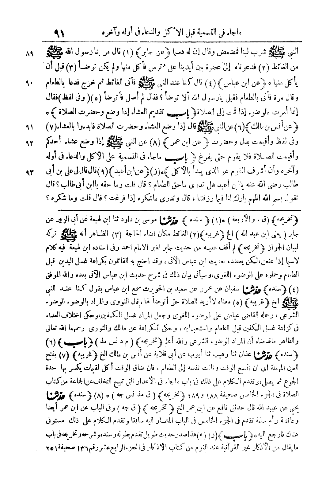 (تخريجه) (ق. والأربعة) * (1) (سندة) حدثنا موسى بن داود ثنا ابن لهيعة عن ابن الزبير عن جابر (يهنى ابن عبد اللة) الخ (غريبة) (2) الغائط مكان قضاء الحاجة (3) الظاهر انة صلى اللة علية وسلم تركة لبيان الجواز (تخريجة) لم اقف علية من حديث جابر لغير الامام احمد وفى اسنادة ابن لهيعة فية كلام لاسيما اذا عنعن لكن يعضد حديث ابن عباس الاتى وقد احتج بة القائلون بكراهة غسل اليدين قبل الطعام وحملوة على الوضوء اللغوى وسياتى بيان ذلك فى شرح حديث ابن العباس الاتى بعدة واللة الموفق (4) (سندة) حدثنا سفيان عن عمرو عن سعيد بن الحويرث سمع ابن الباس يقول كنا عند النبى صلى اللة علية وسلم الخ (غريبة) (5) معناه لا اريد الصلاه حتى اتؤضا لها قال النووى والمراد بالوضوء الوضوء الشرعى وحملة القاضى عياض على الوضوء اللغوى وجعل المراد غسل الكفين وحكى اختلاف العلماء فى كراهة غسل الكفين قبل الطعام واستحبابة وحكى الكراهةعن مالك والثورى رحمهما اللة تعالى والظاهر ما قدمناه ان المراد الوضوءالشرعى واللة اعلم (تخريجة) (م د نس مذ) (باب) (6) (سندة) حدثنا عفان ثنا وهيب ثنا ايوب عن ابى قلابة عن انس بن مالك الخ (غريبة) (7) بفتح العين المهملة اى ان اتسع الوقت وتافت نفسة الى الطعام فان ضاق الوقت اكل لقيمات يكسر بها حدة الجوع ثم يصلى وتقدم الكلام على ذلك فى باب ماجاء فى الاعذار التى تبيح التخلف عن الجماعة من كتاب الصلاه فى الجزء فى الخامس صحيفة 188 و 189 (تخريجة) (ق مذ نس جة) * (8) (سندة) حدثنا يحيى عن عبيد اللة قالحدثنى نافع عن ابى عمر الخ (تخريجة) (ق جة) وفى الباب عن ابى عمر ايضا وعائشة وام سلمة تقدم فى الجزء الخامس فى باب المشار الية سابقا وتقدم الكلام على ذلك مستوفى هناك فارجع الية * (باب) (ز) (9) هذا اصدار حديث طويل تقدم بطولة وسندة وشرحة وتخريجة فى باب ما يقال من الاذكار غير القرانية عند النوم من كتاب الاذكار فى الجزء الرابع عشر رقم 136 صحيفة 251