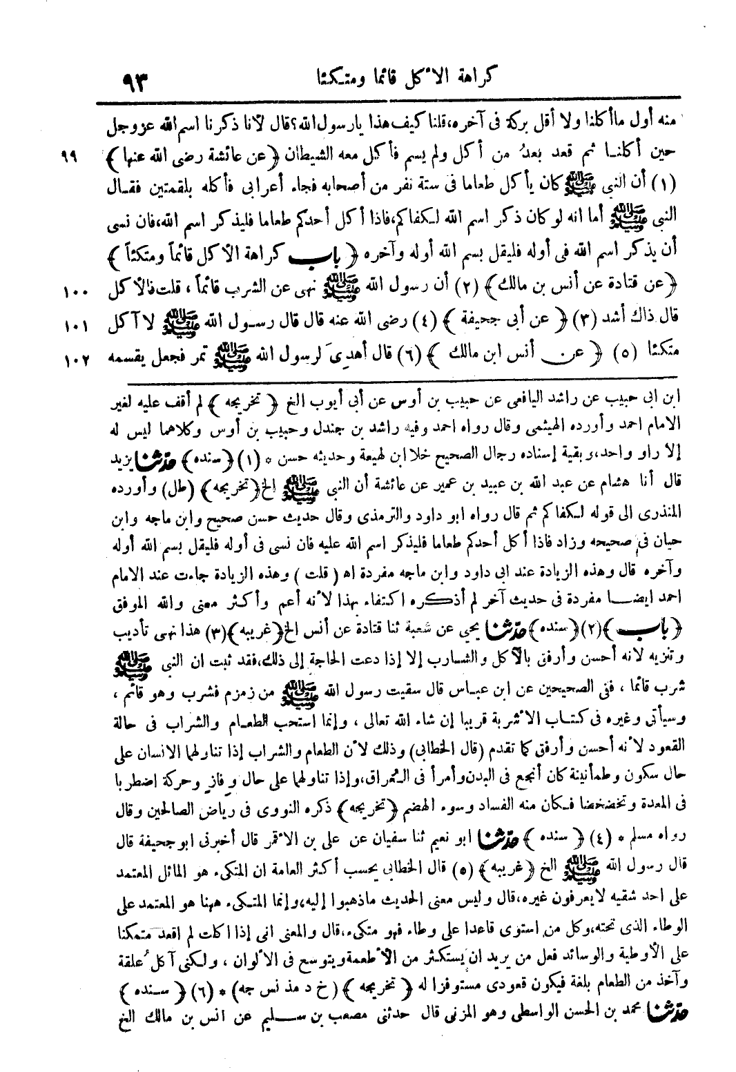 ابن أبي حبيب عن راشد اليافعى عن حبيب بن اوس عن ابى ايوب الخ (تخريجة) لم اقف علية لغير الامام احمد واوردة الهيثمى وقال رواه احمد وفية راشد بن جندل وحبيب بن اوس وكلاهما ليس لة الا راو واحد وبقية اسنادة رجال الصحيح خلا ابن لهيعة وحديثة حسن * (1) (سندة) حدثنا يزيد قال انا هشام عن عبد اللة بن عبيد بن عمير عن عائشة ان النبى صلى اللة علية وسلم الخ (تخريجة) (طل) واوردة المنذرىلا الى قولة لكفا كم ثم قال رواه ابو داود والترمذى وقال حديث حسن صحيح وابن ماجة وابن حسان فى صحيحة وزاد فاذا اكل احدكم طعاما فليذكر اسم اللة علية فان نسى فى اولة فليقل بسم اللة اولة وارة قال وهذة الزيادة عند ابى داود وابن ماجة مفردة اه (قلت) وهذة الزيادة جاءت عند الامام احد ايضا مفردة فى حديث ار لم اذكرة اكتفاء بهذا لانة اعلم واكثر معنى اللة الموفق (باب) (2) (سندة) حدثنا يحيى عن شعبة ثنا قتادة عن انس الخ (غريبة) (3) هذا نهى تأديب وتنزية لانة احسن وارفق بلاكل والشارب الا اذا دعت الحاجة الى ذلك فقد ثبت ان النبى صلى اللة علية وسلم شرب قائما ففى الصحيحين عن ابن عباس قال سقيت رسول اللة صلى اللة علية وسلم من زمزم فشرب وهو قائم وسيأتى وغيرة فى كتاب الاشرية قريبا ان شاء اللة تعالى وانما استحب الطعام والشراب فى حالة القعود لانة احسن وارفق كما تقدم (قال الطابى) وذلك لان الطعام والشراب اذا تناولهما الانسان علىحال سكون وطمانينة كان انجع فى البدن وامرا فى العراق واذا تناولها على حال وفاز وحركة اضطربا فى المعدة وتخضخضا فكان منة الفساد وسوء الهضم (تخريجة) ذكر النووى فى رياض الصالحين وقال رواه مسلم * (4) (سندة) حدثنا ابو نعيم ثنا سفيان عن على بن الاقمر قال اخبرنى ابو جحيفة قال قال رسول اللة صلى اللة علية وسلم الخ (غريبة) (5) قال الطابى بحسب اكثر العامة ان المتكئ ههنا هو المعتمد على الوطاء الذى تحتة وكل من استوى قاعدا على وطاء فهو متكئ قال والمعنى انى اذا اكلت لم اقعد متمكنا على الاوطية والوسائد فعل من يريد ان تستكثر من الاطعمة ويتوسع فى الالوان ولكنى اكل علقة واخذ من الطعام بلغة فيكون قعودى مستوفزا لة (تخريجة) (د مذ نس جة) * (6) (سندة) حدثنا محمد بن الحسن الواسطى وهو المزنى قال حدثنى مصعب بن سليم عن أنس بن مالك الخ