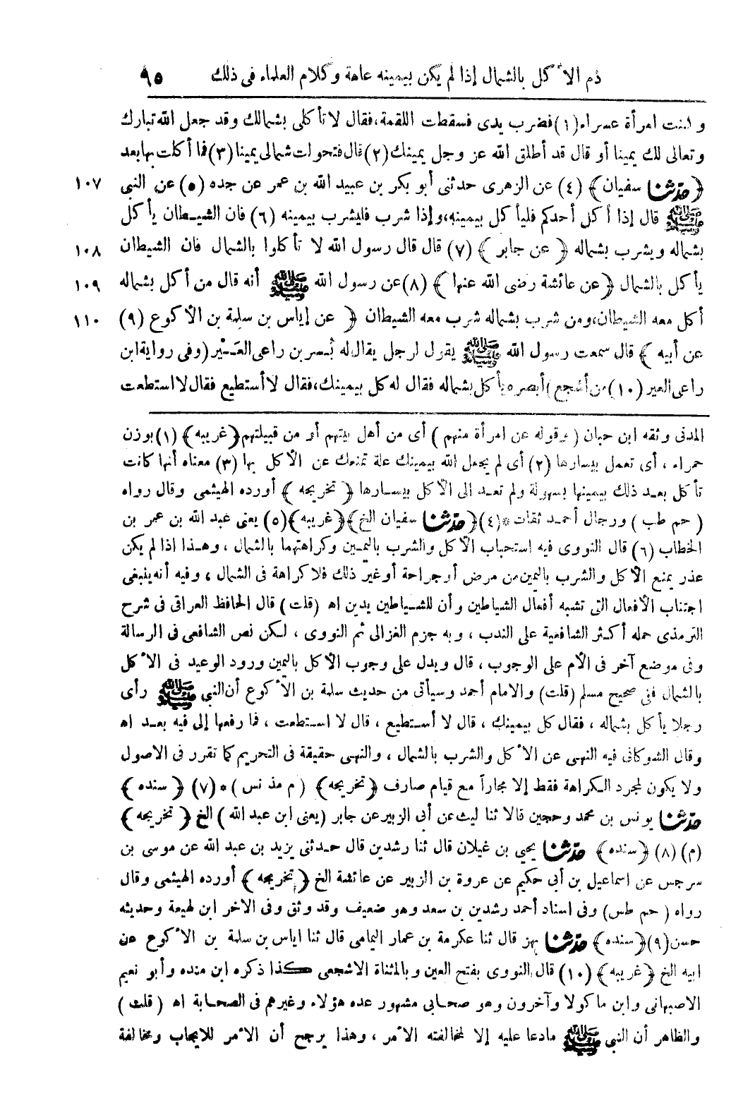 وكنت امرأة عسراء فضرب يدي فسقطت اللقمة، فقال لا تأكلي بشمالك وقد جعل الله تبارك وتعالى لك يمينا أو قال قد أطلق الله عز وجل يمينك قال فتحولت شمالي يمينا فما أكلت بها بعد (حدثنا سفيان) عن الزهري حدثني أبو بكر بن عبيد الله بن عمر عن جده عن النبي صلى الله عليه وسلم قال إذا أكل أحدكم فليأكل بيمينه، وإذا شرب فليشرب بيمينه فإن الشيطان يأكل بشماله ويشرب بشماله (عن جابر) قال قال رسول الله لا تأكلوا بالشمال فإن الشيطان يأكل بالشمال (عن عائشة رضي الله عنها) عن رسول الله صلى الله عليه وسلم أنه قال من أكل بشماله أكل معه الشيطان، ومن شرب بشماله شرب معه الشيطان (عن إياس بن سلمة بن الأكوع عن أبيه) قال سمعت رسول الله صلى الله عليه وسلم يقول لرجل يقال له بسرين راعي العسير (وفي رواية ابن راعي العير من أشجع) أبصره يأكل بشماله فقال له كل بيمينك، فقال لا أستطيع فقال لا استطعت