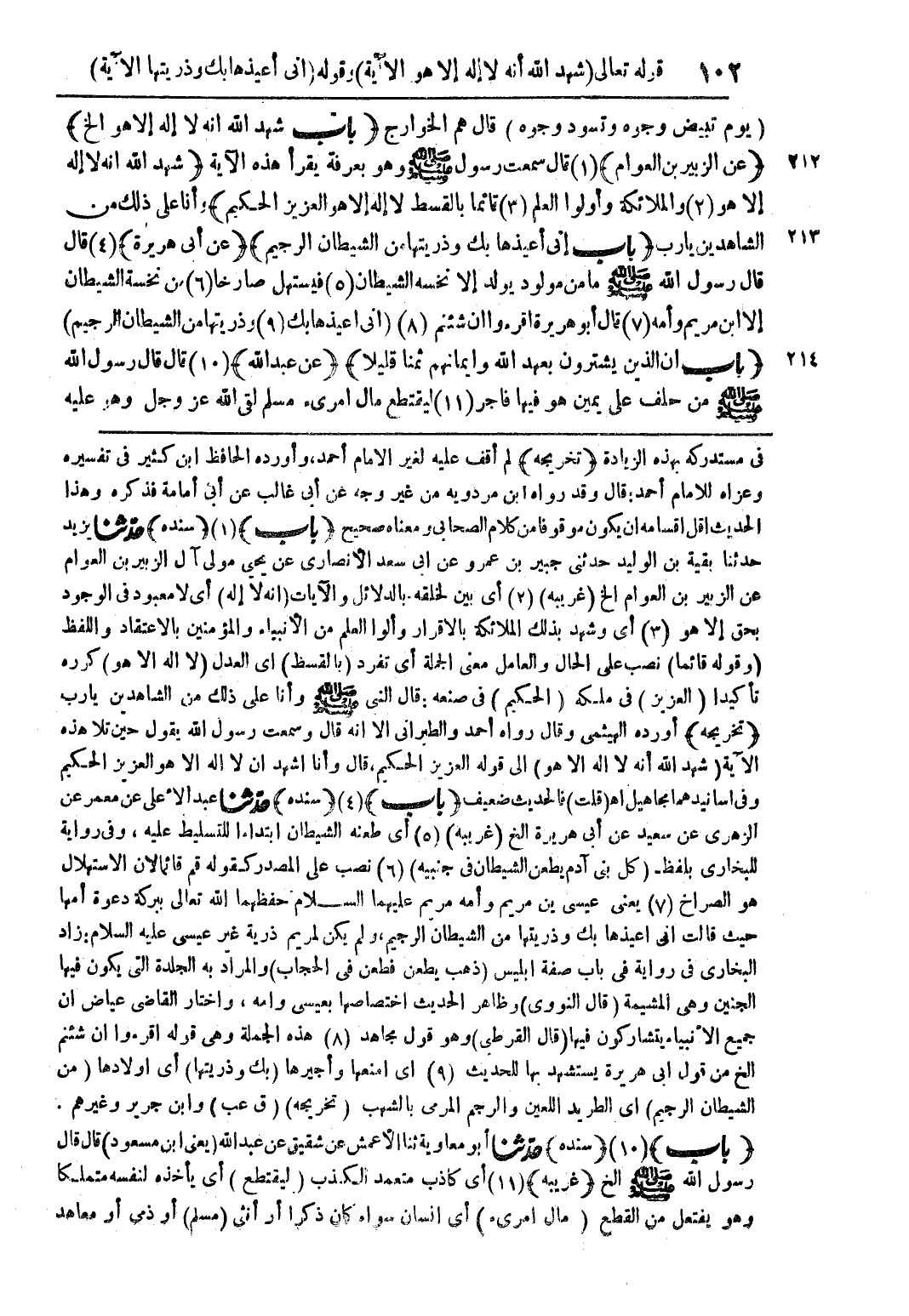 (يوم تبيض وجوه وتسود وجوه) قال هم الخوارج (باب شهد الله انه لا إله إلا هو الخ) (عن الزبير بن العوام) (1) قال سمعت رسول الله صلى الله عليه وسلم وهو بعرفة يقرأ هذه الآية (شهد الله أنه لا إله إلا هو (2) والملائكة وأولو العلم (3) قائما بالقسط لا إله إلا هو العزيز الحكيم) وأنا على ذلك من الشاهدين يا رب (باب إني أعيذها بك وذريتها من الشيطان الرجيم) (عن أبي هريرة) (4) قال قال رسول الله صلى الله عليه وسلم ما من مولود يولد إلا نخسه الشيطان (5) فيستهل صارخا (6) من نسخة الشيطان إلا ابن مريم وأمه (7) قال أبو هريرة اقرءوا ان شئتم (8) (اني أعيذها بك (9) وذريتها من الشيطان الرجيم) (باب ان الذين يشترون بعهد الله وايمانهم ثمنا قليلا) (عن عبد الله) (10) قال قال رسول الله صلى الله عليه وسلم من حلف على يمين هو فيها فاجر (11) ليقتطع مال امرئ مسلم لقى الله عز وجل وهو عليه