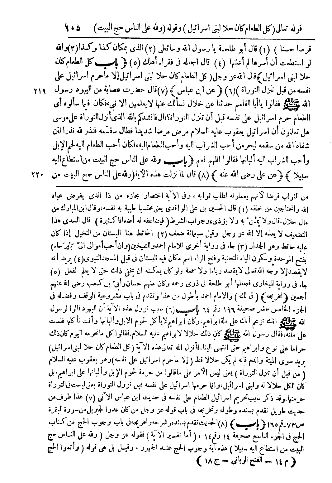 قرضا حسنا) (1) قال أبو طلحة يا رسول الله وحائطي (2) الذي بمكان كذا وكذا (3) والله لو استطعت أن أسرها لم أعلنها (4) قال اجعله في فقراء أهلك (5) (باب كل الطعام كان حلا لبني اسرائيل) قال الله عز وجل (كل الطعام كان حلا لبني اسرائيل إلا ما حرم اسرائيل على نفسه من قبل تنزل التوراة) (6) (عن ابن عباس) (7) قال حضرت عصابة من اليهود رسول الله صلى الله عليه وسلم فقالوا يا ابا القاسم حدثنا عن خلال نسألك عنها لا يعلمهن إلا نبي فكان فيما سألوه أي الطعام حرم اسرائيل على نفسه قبل أن تنزل التوراة؟ قال فانشدكم بالله الذي أنزل التوراة على موسى هل تعلمون أن اسرائيل يعقوب عليه السلام مرض مرضا شديدا فطال سقمه فنذر لله نذرا لئن شفاه الله من سقمه ليحرمن من أحب الشراب إليه وأحب الطعام إليه فكان أحب الطعام إليه لحم الإبل وأحب الشراب إليه ألبانها فقالوا اللهم نعم (باب ولله على الناس حج البيت من استطاع إليه سبيلا) (عن علي رضي الله عنه) (8) قال لما نزلت هذه الآية (ولله على الناس حج البيت من