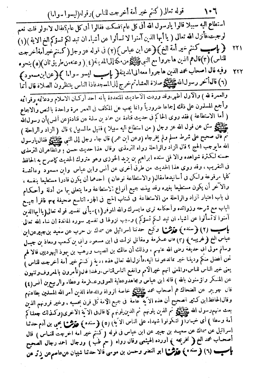 استطاع اليه سبيلا قالوا يا رسول الله أفي كل عام؟ فسكت فقالوا أفي كل عام؟ فقال لا ولو قلت نعم لوجبت فأنزل الله تعالى (يا ايها الذين آمنوا لا تسألوا عن أشياء ان تبد لكم تسؤكم الخ الآية) (1) (باب كنتم خير أمة الخ) (عن ابن عباس) (2) في قوله عز وجل (كنتم خير أمة أخرجت للناس) (3) قال هم الذين هاجروا مع النبي صلى الله عليه وسلم من مكة إلى المدينة (4) (وعنه من طريق ثان) (5) بنحوه وفيه قال أصحاب محمد الذين هاجروا معه إلى المدينة (باب ليسوا سواءا) (عن ابن مسعود) (6) قال آخر رسول الله صلى الله عليه وسلم صلاة العشاء ثم خرج إلى المسجد فإذا الناس ينتظرون الصلاة قال أما