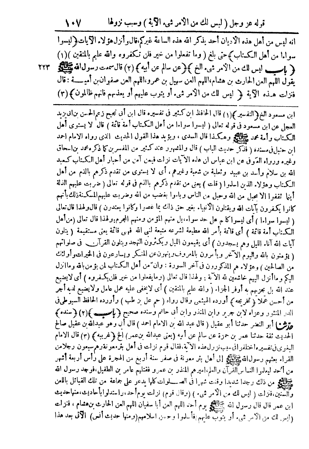 أنه ليس من أهل هذه الأديان أحد يذكر الله هذه الساعة غيركم قال وأنزل هؤلاء الآيات (ليسوا سواءا من أهل الكتاب) حتى بلغ (وما تفعلوا من خير فلن تكفروه والله عليم بالمتقين) (1) (باب ليس لك من الأمر شيء الخ) (عن سالم عن أبيه) (2) قال سمعت رسول الله صلى الله عليه وسلم يقول اللهم العن الحارث بن هشام اللهم العن سهيل بن عمرو اللهم العن صفوان بن أمية قال فنزلت هذه الآية (ليس لك من الأمر شيء أو يتوب عليهم أو يعذبهم فإنهم ظالمون) (3)
