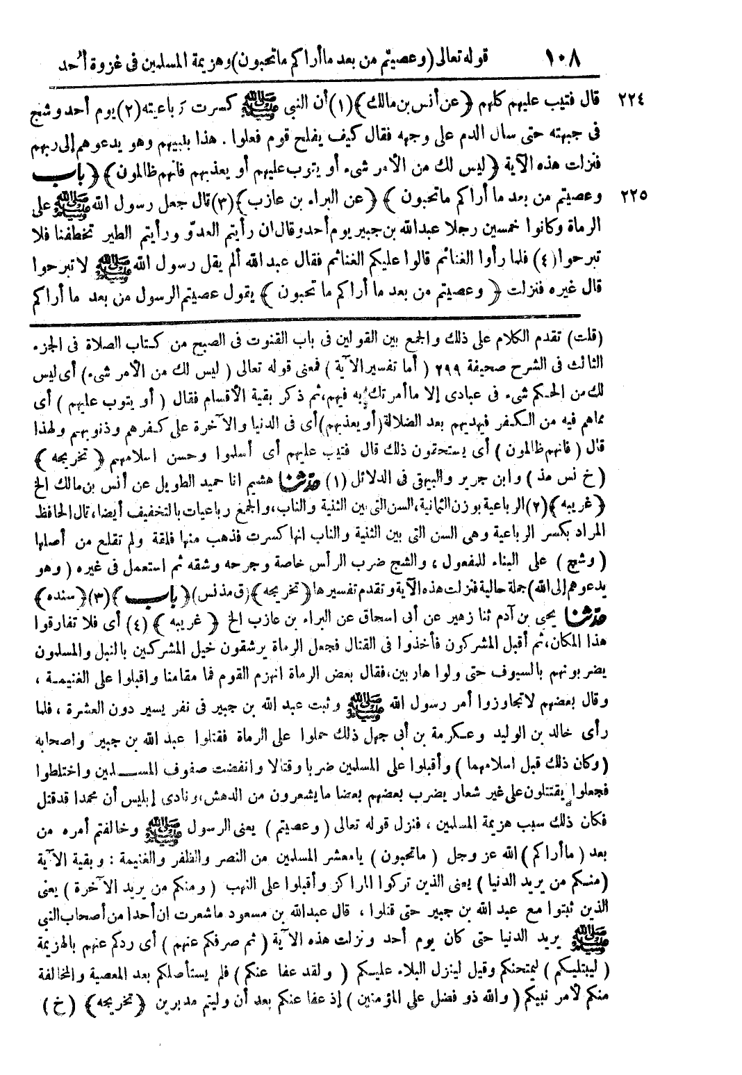 قال فتيب عليهم كلهم (عن أنس بن مالك) (1) أن النبي صلى الله عليه وسلم كسرت رباعيته (2) يوم أحد وشج في جبهته حتى سال الدم على وجهه فقال كيف يفلح قوم فعلوا هذا بنبيهم وهو يدعوهم إلى ربهم فنزلت هذه الآية (ليس لك من الأمر شيء أو يتوب عليهم أو يعذبهم فإنهم ظالمون) (باب وعصيتم من بعد ما أراكم ما تحبون) (عن البراء بن عازب) (3) قال جعل رسول الله صلى الله عليه وسلم على الرماة وكانوا خمسين رجلا عبد الله بن جبير يوم أحد وقال ان رأيتم العدو ورأيتم الطير تخطفنا فلا تبرحوا (4) فلما رأوا الغنائم قالوا عليكم الغنائم فقال عبد الله ألم يقل رسول الله صلى الله عليه وسلم لا تبرحوا قال غيره فنزلت (وعصيتم من بعد ما أراكم ما تحبون) يقول عصيتم الرسول من بعد ما أراكم