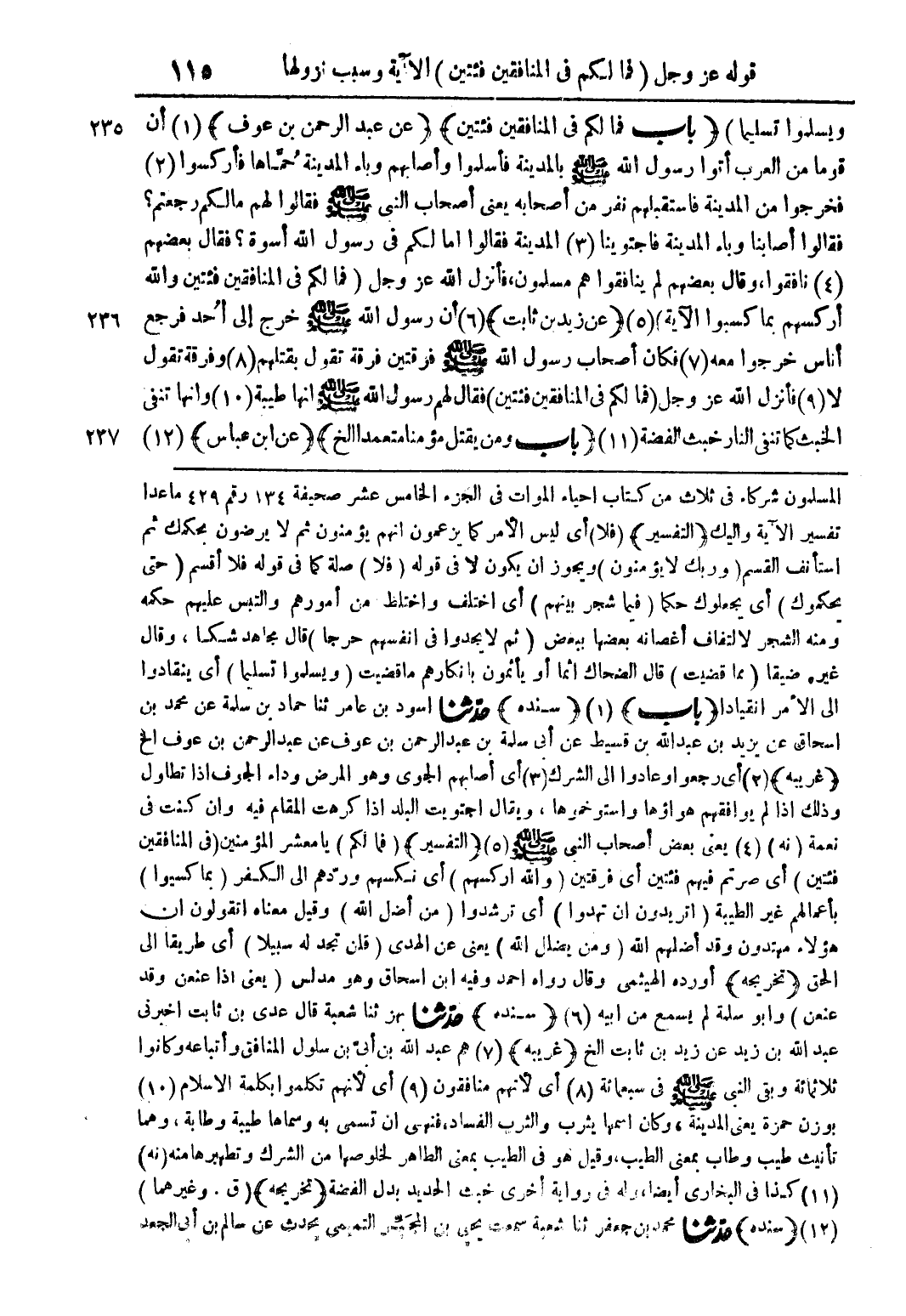 ويسلموا تسليما) (باب فما لكم في المنافقين فئتين) (عن عبد الرحمن بن عوف) (1) أن قوما من العرب أتوا رسول الله صلى الله عليه وسلم بالمدينة فأسلموا وأصابهم وباء المدينة حماها فأركسوا (2) فخرجوا من المدينة فاستقبلهم نفر من أصحابه يعني أصحاب النبي صلى الله عليه وسلم فقالوا لهم مالكم رجعتم؟ فقالوا أصابنا وباء المدينة فاجتوينا (3) المدينة فقالوا أما لكم في رسول الله أسوة؟ فقال بعضهم (4) نافقوا وقال بعضهم لم ينافقوا هم مسلمون فأنزل الله عز وجل (فما لكم في المنافقين فئتين والله أركسهم بما كسبوا الآية) (5) (عن زيد بن ثابت) (6) أن رسول الله صلى الله عليه وسلم خرج إلى أحد فرجع أناس خرجوا معه (7) فكان أصحاب رسول الله صلى الله عليه وسلم فرقتين فرقة تقول بقتلهم (8) وفرقة تقول لا (9) فأنزل الله عز وجل (فما لكم في المنافقين فئتين) فقال لهم رسول الله صلى الله عليه وسلم انها طيبة (10) وأنها تنفي الخبث كما تنفي النار خبث الفضة (11) (باب ومن يقتل مؤمنا متعمدا الخ) (عن ابن عباس) (12)