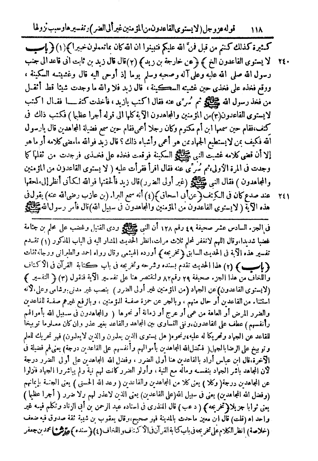 في الجزء السادس عشر صحيفة 49 رقم 128 أن النبي صلى الله عليه وسلم ودى القتيل وغضب على محلم بن جثامة غضبا شديدا وقال اللهم لا تغفر لمحلم ثلاث مرات انظر الحديث المشار إليه في الباب المذكور (1) تقدم تفسير هذه الآية في الحديث السابق (تخريجه) أورده الهيثمي وقال رواه أحمد والطبراني ورجاله ثقات (باب) (2) هذا الحديث تقدم بسنده وشرحه وتخريجه في باب كتابة القرآن في الأكتاف واللخاف من هذا الجزء صحيفة 29 رقم 82 ولنقتصر هنا على تفسير الآية فنقول (3) (التفسير) (لا يستوي القاعدون) عن الجهاد (من المؤمنين غير أولى الضرر) بنصب غير مدني وشامي وعلى لأنه استثناء من القاعدين أو حال منهم وبالجر عن حمزة صفة للمؤمنين وبالرفع غيرهم صفة للقاعدين والضرر المرض أو العاهة من عمى أو عرج أو زمانة أو نحوها (والمجاهدون في سبيل الله بأموالهم وأنفسهم) عطف على القاعدون ونفى التساوي بين المجاهد والقاعد بغير عذر وان كان معلوما توبيخا للقاعد عن الجهاد وتحريكا له عليه ونحوه (هل يستوي الذين يعلمون والذين لا يعلمون) فهو تحريك للعلم وتوبيخ على الرضا بالجهل (فضل الله المجاهدين بأموالهم وأنفسهم على القاعدين درجة) يعني لهم فضيلة في الآخرة قال ابن عباس أراد بالقاعدين هنا أولى الضرر وفضل الله المجاهدين على أولى الضرر درجة لأن المجاهد باشر الجهاد بنفسه وماله مع النية وأولو الضرر كانت لهم نية ولم يباشروا الجهاد فنزلوا عن المجاهدين درجة (وكلا) يعني كلا من المجاهدين والقاعدين (وعد الله الحسنى) يعني الجنة بإيمانهم (وفضل الله المجاهدين) يعني في سبيل اله (على القاعدين) يعني الذين لا عذر لهم ولا ضرر (أجرا عظيما) يعني ثوابا جزيلا (تخريجه) (د عب) قال المنذري في اسناده عبد الرحمن بن أبي الزناد وتكلم فيه غير واحد اهـ (قلت) قال ابن معين ما حدث بالمدينة فهو صحيح وقال يعقوب بن شيبة ثقة صدوق فيه ضعف (خلاصة) انظر الكلام على تخريجه في باب كتابة القرآن في الأكتاف واللخاف (4) (سنده) حدثنا محمد بن جعفر