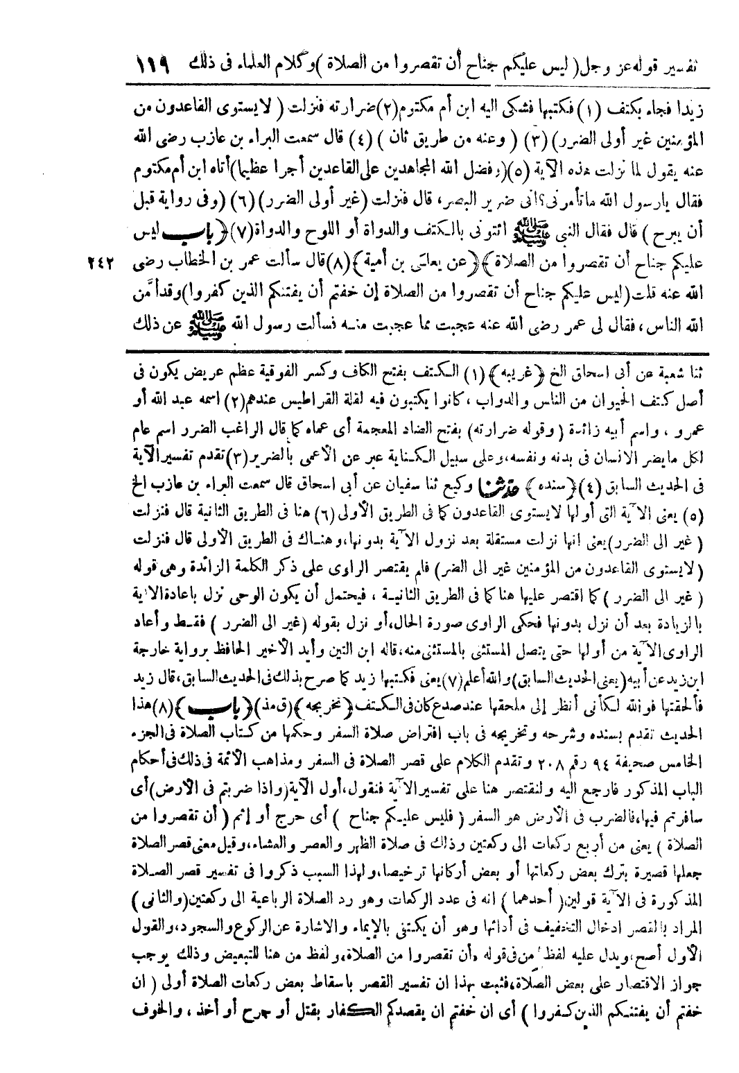 ثنا شعبة عن أبي اسحاق الخ (غريبه) (1) الكتف بفتح الكاف وكسر الفوقية عظم عريض يكون في أصل كتف الحيوان من الناس والدواب كانوا يكتبون فيه لقلة القراطيس عندهم (2) اسمه عبد الله أو عمرو واسم أبيه زائدة (وقوله ضرارته) بفتح الضاد المعجمة أي عماه كما قال الراغب الضرر اسم عام لكل ما يضر الانسان في بدنه ونفسه وعلى سبيل الكناية عبر عن الأعمى بالضرير (3) تقدم تفسير الآية في الحديث السابق (4) (سنده) حدثنا وكيع ثنا سفيان عن أبي اسحاق قال سمعت البراء بن عازب الخ (5) يعني الآية التي أولها لا يستوي القاعدون كما في الطريق الأولى (6) هنا في الطريق الثانية قال فنزلت (غير الى الضرر) يعني أنها نزلت مستقلة بعد نزول الآية بدونها وهناك في الطريق الأولى قال فنزلت (لا يستوي القاعدون من المؤمنين غير الى الضر) فلم يقتصر الراوي على ذكر الكلمة الزائدة وهي قوله (غير الي الضرر) كما اقتصر عليها هنا كما في الطريق الثانية فيحتمل أن يكون الوحي نزل بإعادة الآية بالزيادة بعد أن نزل بدونها فحكى الراوي صورة الحال أو نزل بقوله (غير الي الضرر) فقط وأعاد الراوي الآية من أولها حتى يتصل المستثنى بالمستثنى منه قال ابن التين وأيد الأخير الحافظ برواية خارجة ابن زيد عن أبيه (يعني الحديث السابق) والله أعلم (7) يعني فكتبها زيد كما صرح بذلك في الحديث السابق قال زيد فألحقتها فوالله لكأني أنظر إلى ملحقها عند صدع كان في الكتف (تخريجه) (ق مذ) (باب) (8) هذا الحديث تقدم بسنده وشرحه وتخريجه في باب افتراض صلاة السفر وحكمها من كتاب الصلاة في الجزء الخامس صحيفة 94 رقم 208 وتقدم الكلام على قصر الصلاة في السفر ومذاهب الأئمة في ذلك في أحكام الباب المذكور فأرجع اليه ولنقتصر هنا على تفسير الآية فنقول أول الآية (واذا ضربتم في الأرض) أي سافرتم فيها فالضرب في الأرض هو السفر (فليس عليكم جناح) أي حرج أو إثم (ان تقصروا من الصلاة) يعني بين أربع ركعات إلى ركعتين وذلك في صلاة الظهر والعصر والعشاء وقيل معنى قصر الصلاة جعلها قصيرة بترك بعض ركعاتها أو بعض أركانها ترخيصا ولهذا السبب ذكروا في تفسير قصر الصلاة المذكورة في الآية قولين (أحدهما) أنه في عدد الركعات وهو رد الصلاة الرباعية إلى ركعتين (والثاني) المراد بالقصر ادخال التخفيف في أدائها وهو أن يكتفي بالإيمان والاشارة عن الركوع والسجود والقول الأول أصح ويدل عليه لفظ من في قوله (أن تقصروا من الصلاة) ولفظ من هنا للتبعيض وذلك يوجب جواز الاقتصار على بعض الصلاة فثبت بهذا ان تفسير القصر باسقاط بعض ركعات الصلاة أولى (ان خفتم أن يفتنكم الذين كفروا) أي ان خفتم ان يقصدكم الكفار بقتل أو جرح أو أخذ والخوف