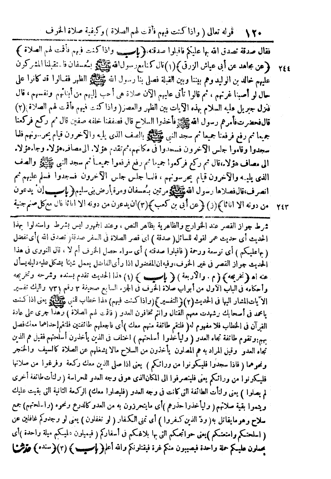 شرط جواز القصر عند الخوارج والظاهرية بظاهر النص وعند الجمهور ليس بشرط واستدلوا بهذا الحديث اي حديث عمر لقوله للسائل (صدقة) أي قصر الصلاة في السفر صدقة (تصدق الله) أي تفضل (بها عليكم) أي توسعة ورحمة (فاقبلوا صدقته) أي سواء حصل الخوف أم لا قال النووي في هذا الحديث جواز القصر في غير الخوف وفيه أن المفضول اذا رأى الفاضل يعمل شيئا يشكل عليه دليله يسأل عنه اهـ (تخريجه) (م والأربعة) (باب) (1) هذا الحديث تقدم بسنده وشرحه وتخريجه واحكامه في الباب الأول من أبواب صلاة الخوف في الجزء السابع صحيفة 3 رقم 731 واليك تفسير الآيات المشار اليها في الحديث (2) (التفسير) (واذا كنت فيهم) هذا خطاب للنبي صلى الله عليه وسلم يعني اذا كنت يا محمد في أصحابك وشهدت معهم القتال وأنتم تخافون العدو (فاقمت لهم الصلاة) وهذا جرى على عادة القرآن في الخطاب فلا مفهوم له (فلتقم طائفة منهم معك) أي فاجعلهم طائفتين فلتقم إحداهما معك فصل بهم وتقوم طائفة تجاه العدو (وليأخذوا أسلحتهم) اختلف في الذين يأخذون أسلحتهم فقيل هم الذين تجاه العدو وقيل المراد به هم المصلون يأخذون من السلاح مالا يشغلهم عن الصلاة كالسيف والخنجر ونحوهما (فإذا سجدوا فليكونوا من ورائكم) يعني اذا صلى الذين معك ركعة وفرغوا من صلاتها فليكونوا من ورائكم يعني فلينصرفوا الى المكان الذي هو في وجه العدو للحراسة (ولتأت طائفة أخرى لم يصلوا) يعني ولتأت الطائفة التي كانت في وجه العدو (فليصلوا معك) الركعة الثانية التي بقيت عليك ويتموا بقية صلاتهم (وليأخذوا حذرهم) أي ما يتحرزون به من العدو كالدرع ونحوه (واسلحتهم) جمع سلاح وهو ما يقاتل به (ود الذين كفروا) أي تمنى الكفار (لو تغفلون) يعني لو وجدوكم غافلين عن (اسلحتكم وامتعتكم) يعني حوائجكم التي بها بلاغكم في أسفاركم (فيميلون عليكم ميلة واحدة) أي يحملون عليكم حملة واحدة فيصيبون منكم غرة فيقتلونكم والله أعلم (باب) (3) (سنده) حدثنا