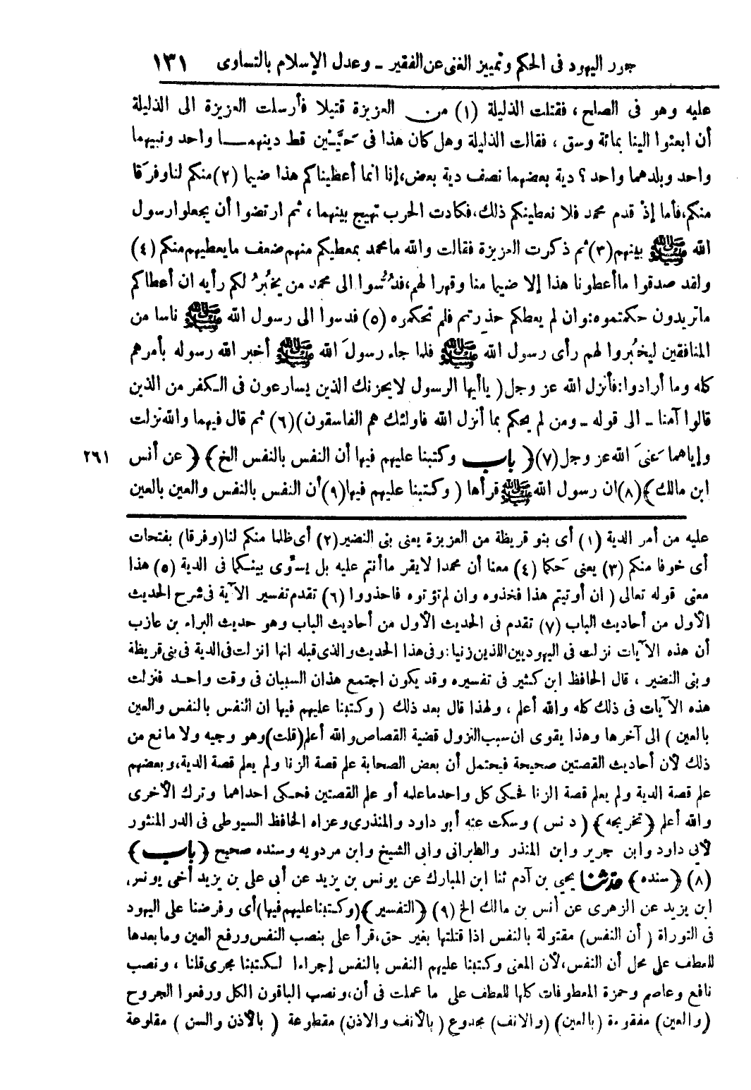 عليه من أمر الدية (1) أي بنو قريظة من العزيزة يعني بني النضير (2) أي ظلما منكم لنا (وفرقا) بفتحات أي خوفا منكم (3) يعني حكما (4) معنا أن محمدا لا يقر ما أنتم عليه بل يسوي بينكما في الدية (5) هذا معنى قوله تعالى (ان أوتيتم هذا فخذوه وان لم تؤتوه فاحذروا (6) تقدم تفسير الآية في شرح الحديث الأول من أحاديث الباب (7) تقدم في الحديث الأول من أحاديث الباب وهو حديث البراء بن عازب أن هذه الآيات نزلت في اليهوديين اللذين زنيا وفي هذا الحديث والذي قبله انها انزلت في الدية في بني قريظة وبني النضير قال الحافظ ابن كثير في تفسيره وقد يكون اجتمع هذان السببان في وقت واحد فنزلت هذه الآيات في ذلك كله والله أعلم ولهذا قال بعد ذلك (وكتبنا عليهم فيها ان النفس بالنفس والعين بالعين) إلى آخرها وهذا يقوي أن سبب النزل قضية القصاص والله أعلم (قلت) وهو وجيه ولا مانع من ذلك لأن أحاديث القصتين صحيحه فيحتمل أن بعض الصحابة علم قصة الزنا ولم يعلم قصة الدية وبعضهم علم قصة الدية ولم يعلم قصة الزنا فحكى كل واحد ما علمه أو علم القصتين فحكى احداهما وترك الأخرى والله أعلم (تخريجه) (د نس) وسكت عنه أبو داود والمنذري وعزاه الحافظ السيوطي في الدر المنثور لأبي داود وابن جرير وابن المنذر والطبراني وأبي الشيخ وابن مردوية وسنده صحيح (باب) (8) (سنده) حدثنا يحيى بن آدم ثنا ابن المبارك عن يونس بن يزيد عن أبي علي بن يزيد أخي يونس ابن يزيد عن الزهري عن أنس بن مالك الخ (9) (التفسير) (وكتبنا عليهم فيها) أي وفرضنا على اليهود في التوراة (أن النفس) مقتولة بالنفس اذا قتلتها بغير حق قرأ على بنصف النفس ورفع العين وما بعدها للعطف على محل أن النفس لأن المعنى وكتبنا عليهم النفس بالنفس إجراءا لكتبنا مجرى قلنا ونصب نافع وعاصم وحمزة المعطوفات كلها للعطف على ما عملت في أن ونصب الباقون الكل ورفعوا الجروح (والعين) مفقوءة (بالعين) (والأنف) مجدوع (بالأنف والأذن) مقطوعة (بالأذن والسن) مقلوعة