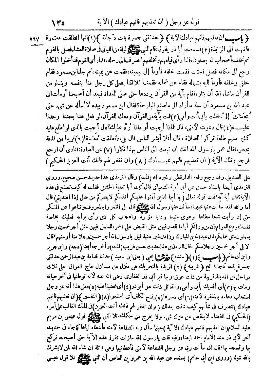 (باب إن تعذبهم فإنهم عبادك الآية) (حدثني جسرة بنت دجانة) (1) انها انطلقت معتمرة فانتهت إلى الربذة (2) فسمعت أب ذر يقول قام النبي صلى الله عليه وسلم ليلة من الليالي في صلاة العشاء فصلى بالقوم ثم تخلف أصحاب له يصلون فلما رأى قيامهم وتخلفهم انصرف إلى رحله فلما رأى القوم قد أخلوا المكان رجع إلى مكانه فصلى فجئت فقمت خلفه فأومأ إلى بيمينه فقمت عن يمينه ثم جاء ابن مسعود فقام خلفي وخلفه فأومأ اليه بشماله فقام عن شماله فقمنا ثلاثتنا يصلي كل رجل منا بنفسه ويتلو من القرآن ما شاء الله أن يتلو فقام بآية من القرآن يرددها حتى صلى الغداة فبعد أن أصبحنا أومأت إلى عبد الله بن مسعود أن سله ما أراد إلى ما صنع البارحة؟ فقال ابن مسعود بيده لا اسأله عن شيء حتى يحدث إلي فقلت بأبي أنت وأمي (3) قمت بآية من القرآن ومعك القرآن لو فعل هذا بعضنا وجدنا عليه (4) قال دعوت لأمي قال فماذا أجبت أو ماذا رد عليك؟ قال أجبت بالذي لو اطلع عليه كثير منهم طلعة تركوا الصلاة قال أفلا أبشر الناس قال بلى فانطلقت معنقا (6) قريبا من قذفة بحجر فقال عمر يا رسول الله انك ان تبعث إلى الناس بهذا نكأوا (7) عن العبادة فنادى ان ارجع فرجع وتلك الآية (أن تعذبهم فإنهم عبادك (8) وان تغفر لهم فإنك أنت العزيز الحكيم)