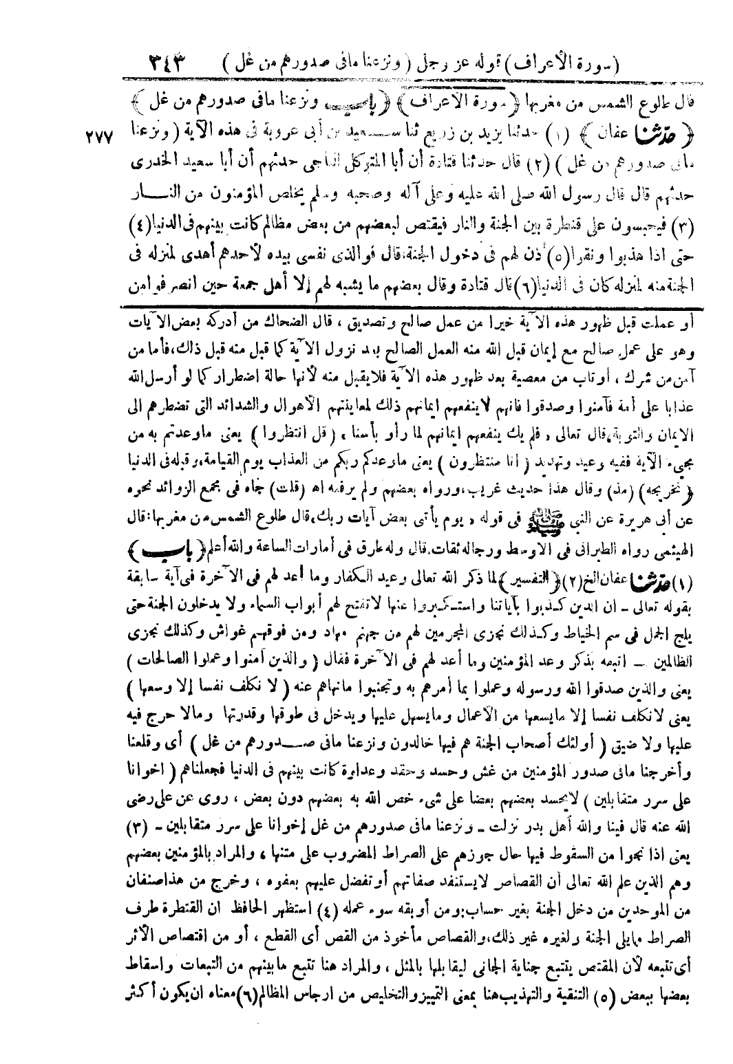 قال طلوع الشمس من مغربها (سورة الأعراف) (باب ونزعنا ما في صدورهم من غل) (حدثنا عفان) (1) حدثنا يزيد بن زريع ثنا سعيد بن أبي عروبة في هذه الآية (ونزعنا ما في صدورهم من غل) (2) قال حدثنا قتادة أن أبا المتوكل الباجي حدثهم أن أبا سعيد الخدري حدثهم قال قال رسول الله صلى الله عليه وعلى آله وصحبه وسلم يخلص المؤمنون من النار (3) فيحسبون على قنطرة بين الجنة والنار فيقتص لبعضهم من بعض مظالم كانت بينهم في الدنيا (4) حتى إذا هذبوا ونقوا (5) أذن لهم في دخول الجنة قال فوالذي نفسي بيده لأحدهم أهدى لمنزله في الجنة منه لمنزله كان في الدنيا (6) قال قتادة وقال بعضهم ما يشبه لهم إلا أهل جمعة حين انصرفوا من