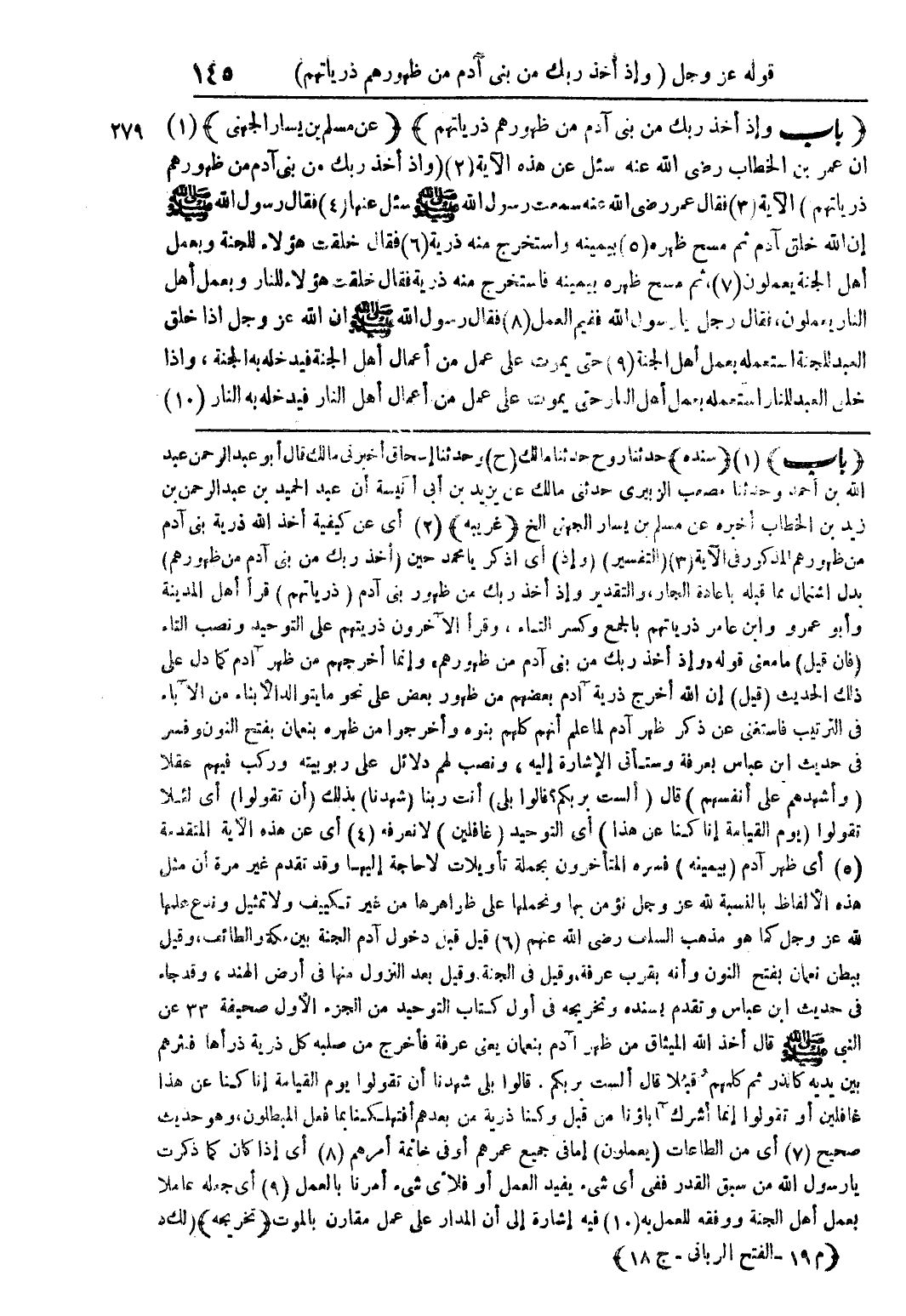 (باب) (1) (سنده) حدثنا روح حدثنا مالك (ح) وحدثنا إسحاق أخبرني مالك قال أبو عبد الرحمن عبد الله بن أحمد وحدثنا مصعب بن الزبير حدثني مالك عن يزيد بن أبي أنيسة أن عبد الحميد بن عبد الرحمن بن زيد بن الخطاب أخبره عن مسلم بن يسار الجهني الخ (غريبه) (2) أي عن كيفية أخذ الله ذرية بني آدم من ظهورهم المذكور في الآية (3) (التفسير) (وإذ) أي اذكر يا محمد حين (أخذ ربك من بني آدم من ظهورهم) بدل اشتمال مما قبله باعادة الجار والتقدير واذ أخذ ربك من ظهور بني آدم (ذرياتهم) قرأ أهل المدينة وأبو عمرو وابن عامر ذرياتهم بالجمع وكسر التاء وقرأ الآخرون ذريتهم على التوحيد ونصب التاء (فإن قيل) ما معنى قوله (واذ أخذ ربك من بني آدم من ظهورهم) وانما أخرجهم من ظهر آدم كما دل على ذلك الحديث (قيل) إن الله أخرج ذرية آدم بعضهم من ظهور بعض على نحو ما يتوالد الأبناء من الآباء في الترتيب فاستغنى عن ذكر ظهر آدم لما علم أنهم كلهم بنوه وأخرجوا من ظهره بنعمان بفتح النون وفسر في حديث ابن عباس بعرفة وستأتي الإشارة اليه ونصب لهم دلالئل على ربوبيته وركب فيهم عقلا (واشهدهم على أنفسهم) قال (ألست بربكم؟ قالوا بلى) أنت ربنا (شهدنا) بذلك (أن تقولوا) أي لئلا تقولوا (يوم القيامة إنا كنا عن هذا) أي التوحيد (غافلين) لا نعرفه (4) اي عن هذه الآية المتقدمة (5) أي ظهر آدم (بيمينه) فسره المتأخرون بحملة تأويلات لا حاجة إليها وقد تقدم غير مرة أن مثل هذه الألفاظ بالنسبة لله عز وجل نؤمن بها ونحملها على ظواهرها من غير تكييف ولا تمثيل وندع علمها لله عز وجل كما هو مذهب السلف رضي الله عنهم (6) قيل فبل دخول آدم الجنة بين مكة والطائف وقيل ببطن نعمان بفتح النون وأنه بقرب عرفة وقيل في الجنة وقيل بعد النزول منها في أرض الهند وقد جاء في حديث ابن عباس وتقدم بسنده وتخريجه في أول كتاب التوحيد من الجزء الأول صحيفة 32 عن النبي صلى الله عليه وسلم قال أخذ الله الميثاق من ظهر آدم بنعمان يعني عرفة فأخرج من صلبه كل ذرية ذرأها فثرهمبين يديه كالذر ثم كلمهم قبلا قال الست بربكم قالوا بلى شهدنا أن تقولوا يوم القيامة إنا كنا عن هذا غافلين أو تقولوا إنما أشرك آباؤنا من قبلنا وكنا ذرية من بعدهم أفتهلكنا بما فعل المبطلون وهو حديث صحيح (7) أي من الطاعات (يعملون) إما في جميع عمرهم أو في خاتمة أمرهم (8) أي إذا كان كما ذكرت يا رسول الله من سبق القدر ففي أي شيء يفيد العمل أو فلأي شيء أمرنا بالعمل (9) اي جعله عاملا بعمل أهل الجنة ووفقه للعمل به (10) فيه إشارة إلى أن المدار على عمل مقارن بالموت (تخريجه) (لك د