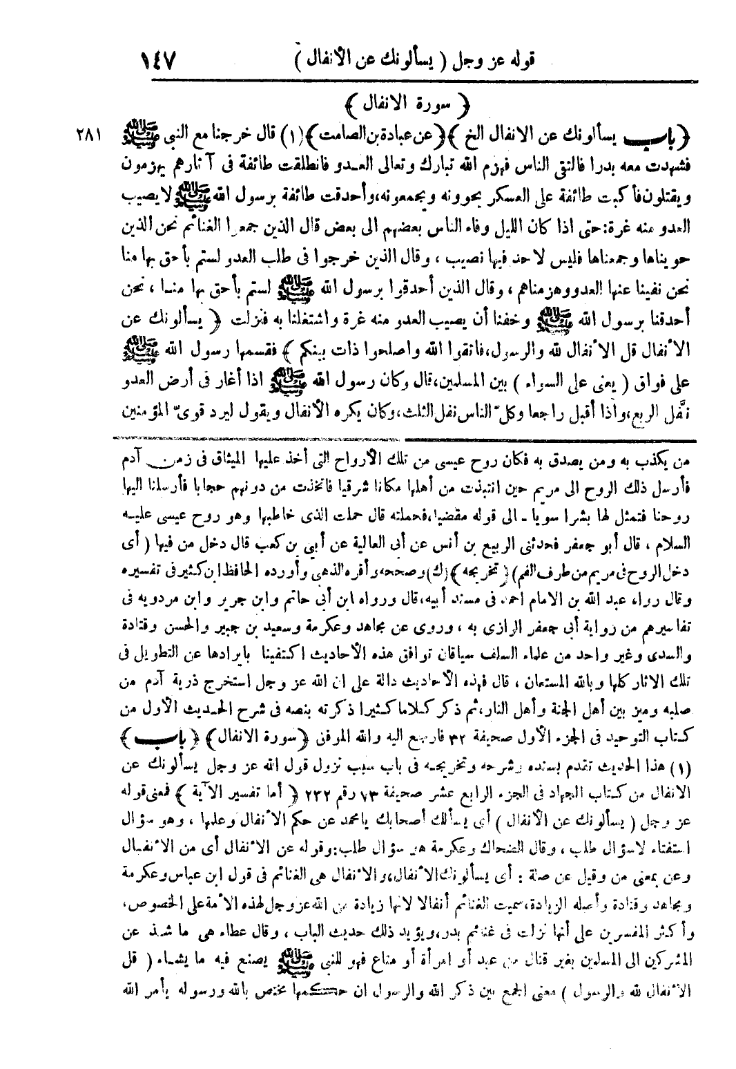 من يكذب به ومن يصدق به فكان روح عيسى من تلك الأرواح التي أخذ عليها الميثاق في زمن آدم فأرسل ذلك الروح الى مريم حين انتبذت من أهلها مكانا شرقيا فاتخذت من دونهم حجابا فأرسلنا اليها روحنا فتمثل لها بشرا سويا - إلى قوله مقضيا فحملته قال حملت الذي خاطبها وهو روح عيسى عليه السلام قال أبو جعفر فحدثني الربيع بن أنس عن أبي العالية عن أبي بن كعب قال دخل من فيها (أي دخل الروح في مريم من طرف الفم) (تخريجه) (ك) وصححه وأقره الذهبي وأورده الحافظ ابن كثير في تفسيره وقال رواه عبد الله بن الامام احمد في مسند أبيه قال ورواه ابن أبي حاتم وابن جرير وابن مردوية في تفاسيرهم من رواية أبي جعفر الرازي به وروى عن مجاهد وعكرمة وسعيد بن جبير والحسن وقتادة والسدي وغير واحد من علماء السلف سياقان توافق هذه الأحاديث اكتفينا بايرادها عن التطوير في تلك الآثار كلها وبالله المستعان قال فهذه الأحاديث دالة على أن الله عز وجل استخرج ذرية آدم من صلبه وميز بين أهل الجنة وأهل النار ثم ذكر كلاما كثيرا ذكرته بنصه في شرح الحديث الأول من كتاب التوحيد في الجزء الأول صحيفة 32 فارجع اليه والله الموفق (سورة الأنفال) (باب) (1) هذا الحديث تقدم بسنده وشرحه وتخريجه في باب سبب نزول قول الله عز وجل يسألونك عن الأنفال من كتاب الجهاد في الجزء الرابع عشر صحيفة 73 رقم 232 (أما تفسير الآية) فمعنى قوله عز وجل (يسألونك عن الأنفال) أي يسألك أصحابك يا محمد عن حكم الأنفال وعلمها وهو سؤال استفتاء لا سؤال طلب وقال الضحاك وعكرمة هو سؤال طلب وقوله عن الأنفال أي من الأنفال وعن بمعنى من وقيل عن صلة أي يسألونك الأنفال والأنفال هي الغنائم في قوله ابن عباس وعكرمة ومجاهد وقتادة وأصله الزيادة سميت الغنائم أنفالا لأنها زيادة من الله عز وجل لهذه الأمة على الخصوص وأكثر المفسرين على أنها نزلت في غنائم بدر ويؤيد ذلك حديث الباب وقال عطاء هي ما شذ عن المشركين إلى المسلمين بغير قتال من عبد أو امرأة أو متاع فهو للنبي صلى الله عليه وسلم يصنع فيه ما يشاء (قل الأنفال لله والرسول) معنى الجمع بين ذكر الله والرسول ان حكمها مختص بالله ورسوله بأمر الله