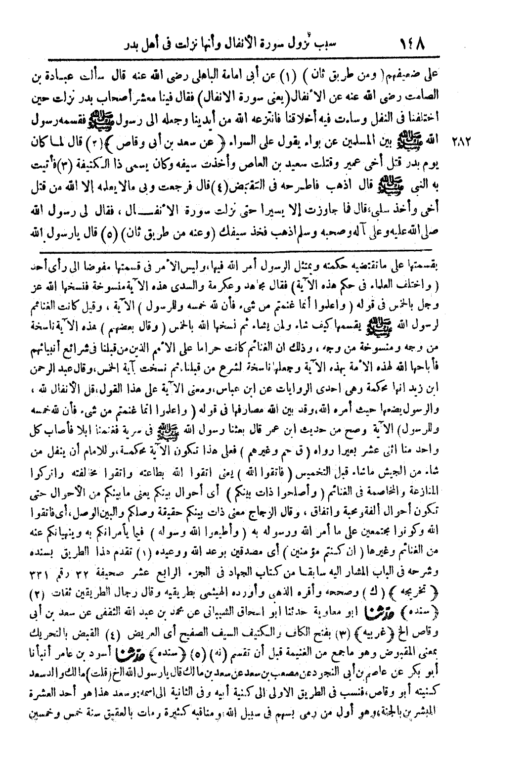 على ضعيفهم (ومن طريق ثان) (1) عن أبي أمامة الباهلي رضي الله عنه قال سألت عبادة بن الصامت رضي الله عنه عن الأنفال (يعني سورة الأنفال) فقال فينا معشر أصحاب بدر نزلت حين اختلفنا في النفل وساءت فيه أخلاقنا فانتزعه الله من أيدينا وجعله إلى رسول الله صلى الله عليه وسلم فقسمه رسول الله صلى الله عليه وسلم بين المسلمين عن بواء يقول عن السراء (عن سعد بن أبي وقاص) (2) قال لما كان يوم بدر قتل أخي عمير وقتلت سعيد بن العاص وأخذت سيفه وكان يسمى ذا الكتيفة (3) فأتيت به النبي صلى الله عليه وسلم قال اذهب فاطرحه في القبض (4) قال فرجعت وبي مالا يعلمه إلا الله من قتل أخي وأخذ سلبى قال فما جاوزت إلا يسيرا حتى نزلت سورة الأنفال فقال لي رسول الله صلى الله عليه وعلى آله وصحبه وسلم اذهب فخذ سيفك (وعنه من طريق ثان) (5) قال يا رسول الله