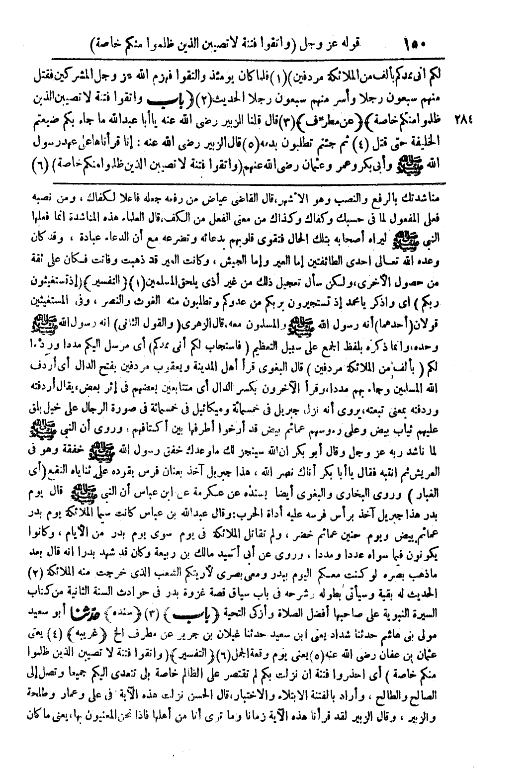لكم أني ممدكم بألف من الملائكة مردفين) (1) فلما كان يومئذ والتقوا فهزم الله عز وجل المشركين فقتل منهم سبعون رجلا وأسر منهم سبعون رجلا الحديث (2) (باب واتقوا فتنة لا تصيبن الذين ظلموا منكم خاصة) (عن مطرف) (3) قال قلنا الزبير رضي الله عنه يا ابا عبد الله ما جاء بكم ضيعتم الخليفة حتى قتل (4) ثم جئتم تطلبون بدمه (5) قال الزبير رضي الله عنه إنا قرأناها على عهد رسول الله صلى الله عليه وسلم وأبي بكر وعمر وعثمان رضي الله عنهم (واتقوا فتنة لا تصيبن الذين ظلموا منكم خاصة) (6)
