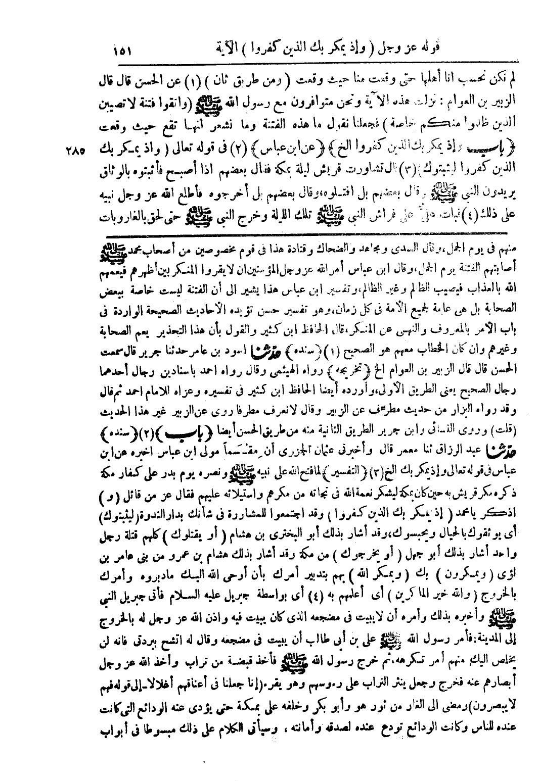 منهم في يوم الجمل وقال السدي ومجاهد والضحاك وقتادة هذا في قوم مخصوصين من أصحاب محمد صلى الله عليه وسلم أصابتهم الفتنة يوم الجمل وقال ابن عباس أمر الله عز وجل المؤمنين أن لا يقروا المنكريين أظهرهم فيعمهم الله بالعذاب فيصيب الظالم وغير الظالم وتفسير ابن عباس هذا يشير إلى أن الفتنة ليست خاصة ببعض الصحابة بل هي عامة لجميع الأمة في كل زمان وهو تفسير حسن تؤيده الأحاديث الصحيحة الواردة في باب الأمر بالمعروف والنهي عن المنكر قال الحافظ ابن كثير والقول بأن هذا التحذير يعم الصحابة وغيرهم وان كان الخطاب معهم هو الصحيح (1) (سنده) حدثنا اسود بن عامر حدثنا جرير قال سمعت الحسن قال قال الزبير بن العوام الخ (تخريجه) رواه الهيثمي وقال رواه أحمد باسنادين رجال أحدهما رجال الصحيح يعني الطريق الأولى واورده أيضا الحافظ ابن كثير في تفسيره وعزاه للامام أحمد ثم قال قد رواه البزار من حديث مطرف عن الزبير وقال لا نعرف مطرفا روى عن الزبير غير هذا الحديث (قلت) وروى النسائي وابن جرير الطريق الثانية منه من طريق الحسن أيضا (باب) (2) (سنده) حدثنا عبد الرزاق ثنا معمر قال وأخبرني عثمان الجزري أن مقسما مولى ابن عباس أخبره عن ابن عباس في قوله تعالى وإذ يمكر بك الخ (3) (التفسير) لما فتح الله على نبيه صلى الله عليه وسلم ونصره يوم بدر على كفار مكة ذكره مكر قريش به حين كان بمكة ليشكر نعمة الله في نجاته من مكرهم واستيلائه عليهم فقال عز من قائل (و) اذكر يا محمد (إذ يمكر بك الذين كفروا) وقد اجتمعوا للمشاورة في شأنك بدار الندوة (ليثبتوك) أي يوثقوك بالحيال ويحبسوك وقد اشار بذلك أبو البختري بن هشام (أو يقتلوك) كلهم قتلة رجل واحد أشار بذلك أبو جهل (أو يخرجوك) من مكة وقد أشار بذلك هشام بن عمرو من بني عامر بن لؤي (ويمكرون) بك (ويمكر الله) بهم بتدبير أمرك بأن أوحى الله إليك ما دبروه وأمرك بالخروج (والله خير الماكرين) أي أعلمهم به (4) أي بواسطة جبريل عليه السلام فأتى جبريل النبي صلى الله عليه وسلم وأخبره بذلك وأمره أن لا يبيت في مضجعه الذي كان يبيت فيه واذن الله عز وجل له بالخروج إلى المدينة فأمر رسول الله صلى الله عليه وسلم علي بن أبي طالب أن يبيت في مضجعه وقال له اتشح ببردتي فإنه لن يخلص اليك منهم أمر تكرهه ثم خرج رسول الله صلى الله عليه وسلم فأخذ قبضة من تراب وأخذ الله عز وجل أبصارهم عنه فخرج وجعل ينثر التراب على رءوسهم وهو يقرء (إنا جعلنا في أعناقهم أغلالا - إلى قوله فهم لا يبصرون) ومضى إلى الغار من ثور هو وأبو بكر وخلفه علي بمكة حتى يؤدي عنه الودائع التي كانت عنده للناس وكانت الودائع تودع عنده لصدقه وأمانته وسيأتي الكلام على ذلك مبسوطا في أبواب