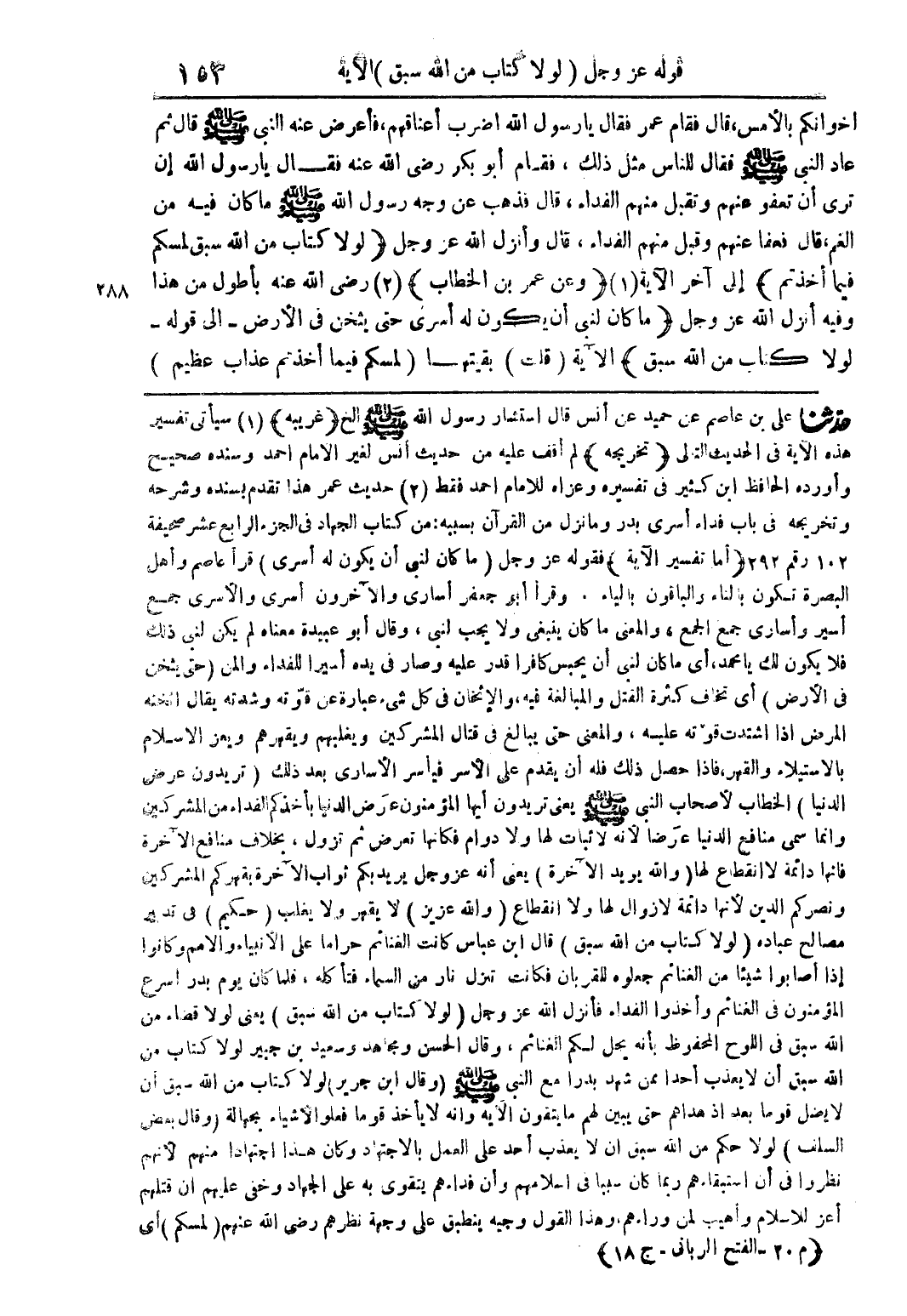 إخوانكم بالأمس، قال فقام عمر فقال يا رسول الله اضرب أعناقهم، فأعرض عنه النبي صلى الله عليه وسلم قال ثم عاد النبي صلى الله عليه وسلم فقال للناس مثل ذلك، فقام أبو بكر رضي الله عنه فقال يا رسول الله إن ترى أن تعفو عنهم وتقبل منهم الفداء، قال فذهب عن وجه رسول الله صلى الله عليه وسلم ما كان فيه من الغم، قال فعفا عنهم وقبل منهم الفداء، قال وأنزل الله عز وجل {لولا كتاب من الله سبق لمسكم فيما أخذتم} إلى آخر الآية (1) (وعن عمر بن الخطاب) (2) رضي الله عنه بأطول من هذا وفيه أنزل الله عز وجل {ما كان لنبي أن يكون له أسرى حتى يثخن في الأرض- إلى قوله- لولا كتاب من الله سبق) الآية (قلت) بقيتها {لمسكم فيما أخذتم عذاب عظيم}