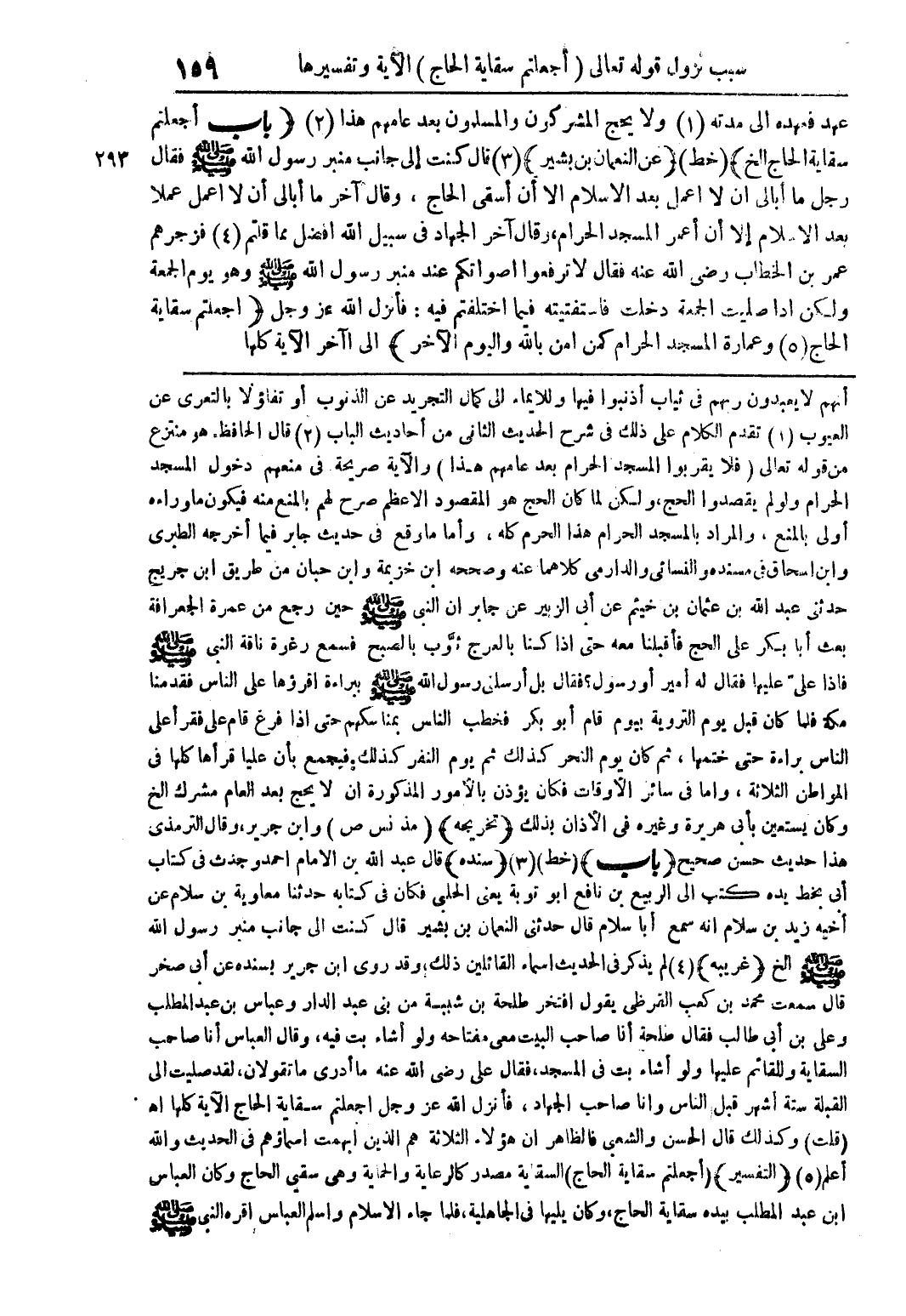 أنهم لا يعبدون ربهم في ثياب أذنبوا فيها وللإيماء إلى كمال التجريد عن الذنوب أو تفاؤلا بالتعري عن العيوب (1) تقدم الكلام على ذلك في شرح الحديث الثاني من أحاديث الباب (2) قال الحافظ هو منتزع من قوله تعالى {فلا يقربوا المسجد الحرام بعد عامهم هذا) والآية صريحة في منعهم دخول المسجد الحرام ولو لم يقصدوا الحج، ولكن لما كان الحج هو المقصود الأعظم صرح لهم بالمنع منه فيكون ما وراءه أولى بالمنع، والمراد بالمسجد الحرام هذا الحرم كله، وأما ما وقع في حديث جابر فيما أخرجه الطبري وابن إسحاق في مسنده والنسائي والدرامي كلاهما عنه وصححه ابن خزيمة وابن حبان من طريق ابن جريج حدثني عبد الله بن عثمان بن خيئم عن أبي الزبير عن جابر ان النبي صلى الله عليه وسلم حين رجع من عمرة الجعرافة بعث أبا بكر على الحج فأقبلنا معه حتى إذا كنا بالعرج ثوب بالصبح فسمع رغوة ناقة النبي صلى الله عليه وسلم فإذا علي عليها فقال له أمير أو رسول؟ فقال بل أرسلني رسول الله صلى الله عليه سولم ببراءة اقرؤها على الناس فقدمنا مكة فلما كان قبل يوم التروية بيوم قام أبو بكر فخطب الناس بمناسكهم حتى إذا فرغ قام علي قرأ على الناس براءة حتى ختمها، ثم كان يوم النحر كذلك ثم يوم النفر كذلك: فيجمع بأن عليا قرأها كلها في المواطن الثلاثة، وأما في سائر الأوقات فكان يؤذن بالأمور المذكورة أن لا يحج بعد العام مشرك الخ وكان يستعين بأبي هريرة وغيره في الأذان بذلك (تخريجه) (مذ نس ص) وابن جرير، وقال الترمذي هذا حديث حسن صحيح (باب) (خط) (3) (سنده) قال عبد الله بن الإمام أحمد وجنث في كتاب أبي بخط يده كتب إلى الربيع بن نافع أبو توبة يعني الحلبي فكان في كتابه حدثنا معاوين بن سلام عن أخيه زيد بن سلام أنه سمع أبا سلام قال حدثني النعمان بن بشير قال كنت إلى جانب منبر رسول الله صلى الله عليه وسلم الخ (غريبه) (4) لم يذكر في الحديث أسماء القائلين ذلك، وقد روى ابن جرير بسنده عن أبي صخر قال سمعت محمد بن كعب القرظي يقول افتخر طلحة بن شيبة من بني عبد الدار وعباس بن عبد المطلب وعلي بن أبي طالب فقال طلحة أنا صاحب البيت معي مفتاحه ولو أشاء بت فيه، وقال العباس أنا صاحب السقاية وللقائم عليها ولو أشاء بت في المسجد، فقال علي رضي الله عنه ما أدري ما تقولان، لقد صليت إلى القبلة ستة أشهر قبل الناس وأنا صاحب الجهاد، فأنزل الله عز وجل أجعلتم سقاية الحاج الآية كلها اهـ. (قلت) وكذلك قال الحسن والشعبي فالظاهر أن هؤلاء الثلاثة هم الذين أبهمت أسماؤهم في الحديث والله أعلم (5) (التفسير) (أجعلتم سقاية الحاج) السقاية مصدر كالرعاية والحماية وهي سقيي الحاج وكان العباس ابن عبد المطلب بيده سقاية الحاج، وكان يليها في الجاهلية، فلما جاء الإسلام وأسلم العباس أقره النبي صلى الله عليه وسلم