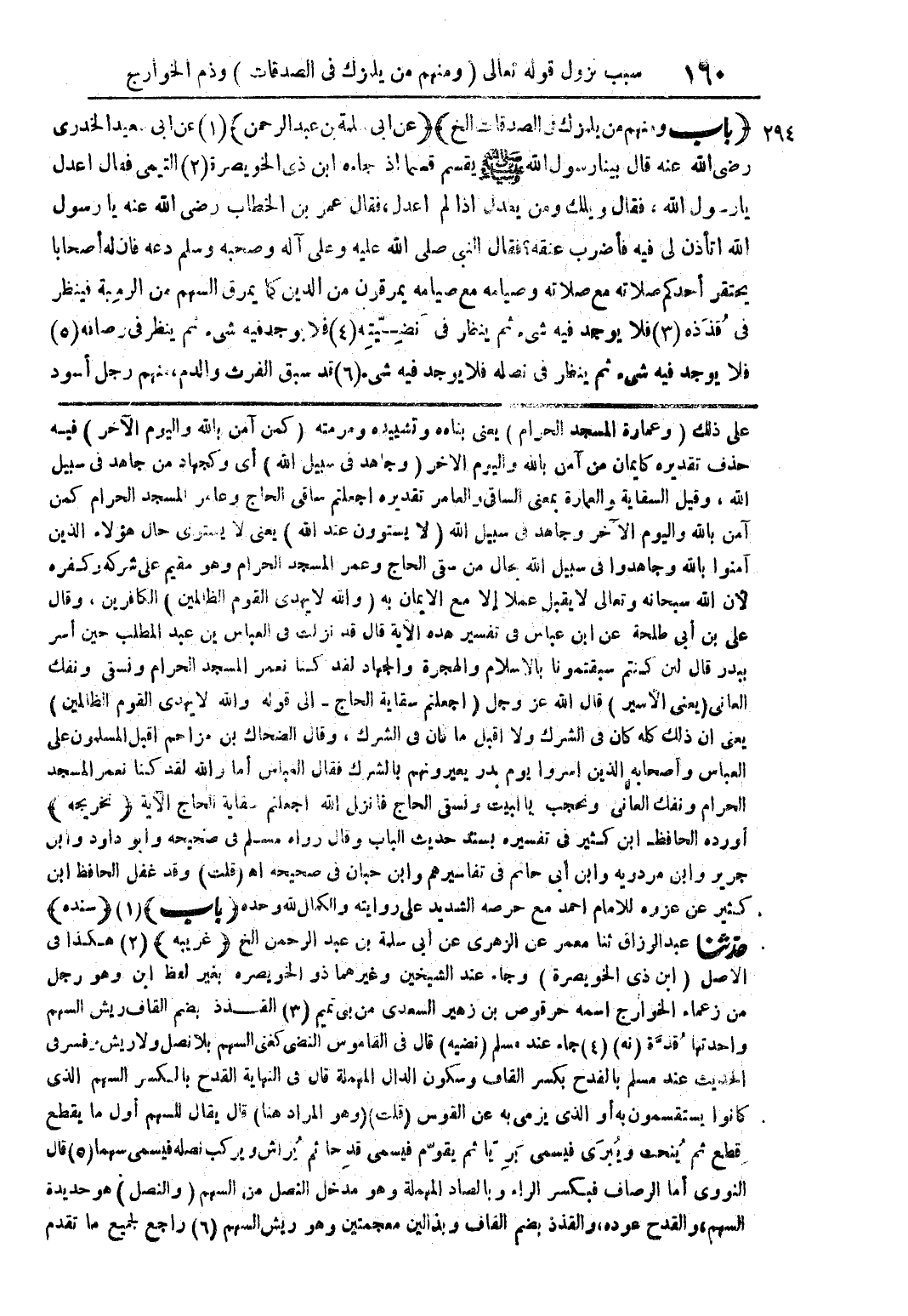 على ذلك (وعمارة المسجد الحرام) يعني بناءه وتشييده ومرمته (كمن آمن بالله واليوم الآخر) فيه حذف تقديره كإيمان من آمن بالله واليوم الآخر (وجاهد في سبيل الله) أي وكجهاد من جاهد في سبيل الله، وقيل السقاية والعمارة بمعنى الساقي والعامر تقديره أجعلتم ساقي الحاج وعامر المسجد الحرام كمن آمن بالله واليوم الآخر وجاهد في سبيل الله (لا يستوون عند الله) يعني لا يستوي حال هؤلاء الذين آمنوا بالله وجاهدوا في سبيل الله بحال من سقى الحاج وعمر المسجد الحرام وهو مقيم على شركه وكفره لأن الله سبحانه وتعالى لا يقبل عملا إلا مع الإيمان به (والله لا يهدي القوم الظالمين) الكافرين، وقال علي بن أبي طلحة عن ابن عباس في تفسير هذه الآية قال قد نزلت في العباس بن عبد المطلب حين أسر ببدر قال لئن كنتم سبقتمونا بالإسلام والهجرة والجهاد لقد كنا نعمر المسجد الحرام ونسقي ونفك العاني (يعني الأسير) قال الله عز وجل {أجعلتم سقاية الحاج- إلى قوله والله لا يهدي القوم الظالمين} يعني أن ذلك كله كان في الشرك ولا أقبل ما كان في الشرك، وقال الضحاك بن مزاحم أقبل المسلمون على العباس وأصحابه الذين أسروا يوم بدر يعيرونهم بالشرك فقال العباس أما والله لقد كنا نعمر المسجد الحرام ونفك العاني ونحجب بالبيت ونسقي الحاج فأنزل الله أجعلتم سقاية الحاج الآية (تخريجه) ورده الحافظ ابن كثير في تفسير بسند حديث الباب وقال رواه مسلم في صحيحه وأبو داود وابن جرير وابن مردويه وابن أبي حاتم في تفاسيرهم وابن حبان في صحيحه اهـ (قلت) وقد غفل الحافظ ابن كثير عن غزره للإمام أحمد مع حرصه الشديد على روايته والكمال لله وحده (باب) (1) (سنده) حدثنا عبد الرزاق ثنا معمر عن الزهري عن أبي سلمة بن عبد الرحمن الخ (غريبه) (2) هكذا في الأصل (ابن ذي الخويصرة) وجاء عند الشيخين وغيرهما ذو الخويصرة بغير لعظ ابن وهو رجل من زعماء الخوارج اسمه حرقوص بن زهير السعدي من بني تميم (3) القذذ بضم القاف ريش السهم واحدتها قذة (نه) (4) جاء عند مسلم (نضيه) قال في القاموس النضي كغنى السهم بلا نصل ولا ريش وفسر في الحديث عن مسلم بالفدح بكسر القاف وسكون الدال المهملة قال في النهاية القدح بالكسر السهم الذي كانوا يستقسمون به أو الذي يرمي به عن القوس (قلت) (وهو المراد هنا) قال يقال السهم أول ما يقطع قطع ثم ينحت ويبرى فيسمى بريا ثم يقوم فيسمى قد حائم يراش ويركب نصله فيسمى سهما (5) قال النووي أما الرصاف فبكسر الراء وبالصاد المهملة وهو مدخل النصل من السهم (والنصل) هو حديدة السهم، والقدح عوده، والقذذ بضم القاف وبذالين معجمتين وهو ريش السهم (6) راجع لجميع ما تقدم